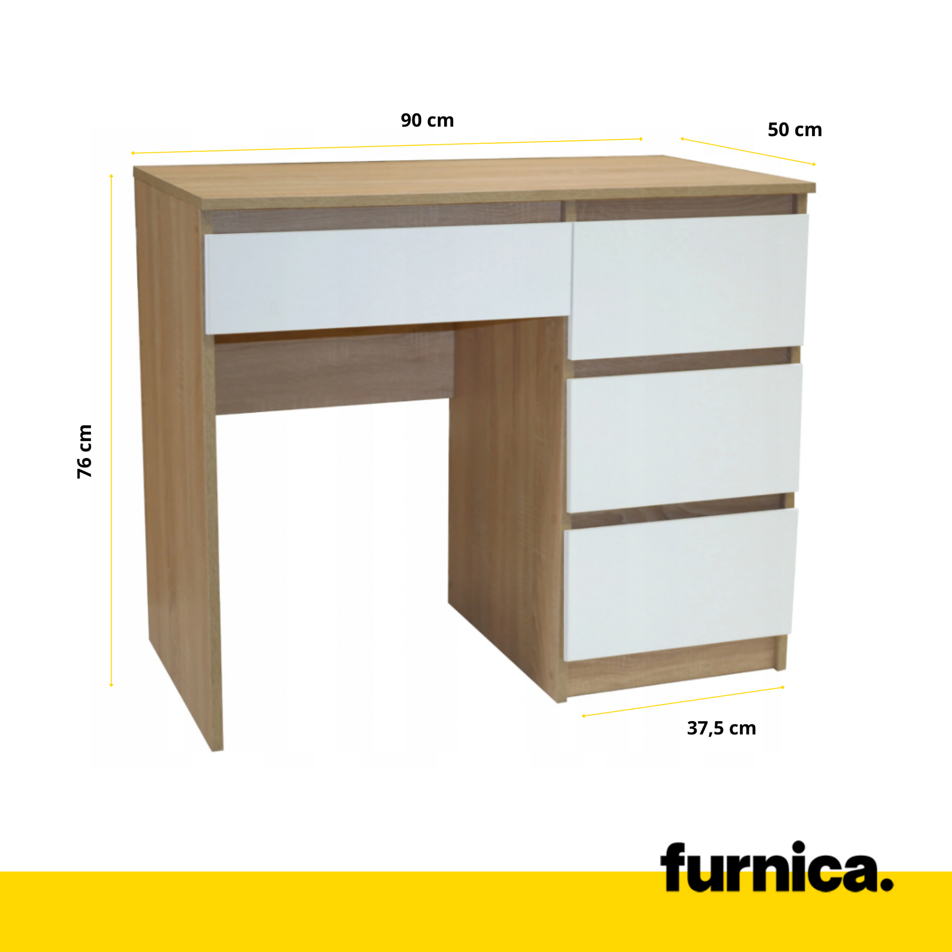 Wenn Sie von einem praktischen Computertisch träumen, könnte Sie unser neues Möbelstück interessieren. Er ist 76 cm hoch, 90 cm breit und 50 cm tief. Er wurde aus starken, 16 mm dicken melaminbeschichteten Spanplatten und zusätzlich aus Hochdichte-Faserplatten hergestellt. Diese Materialien sind sehr strapazierfähig und fest, sodass dieses preiswerte Möbelstück sicherlich lange an Ihrer Seite leben wird. Der Korpus ist in Sonoma-Eiche-Farbe gehalten und die Schubladen sind weiß. Alles ist matt veredelt.