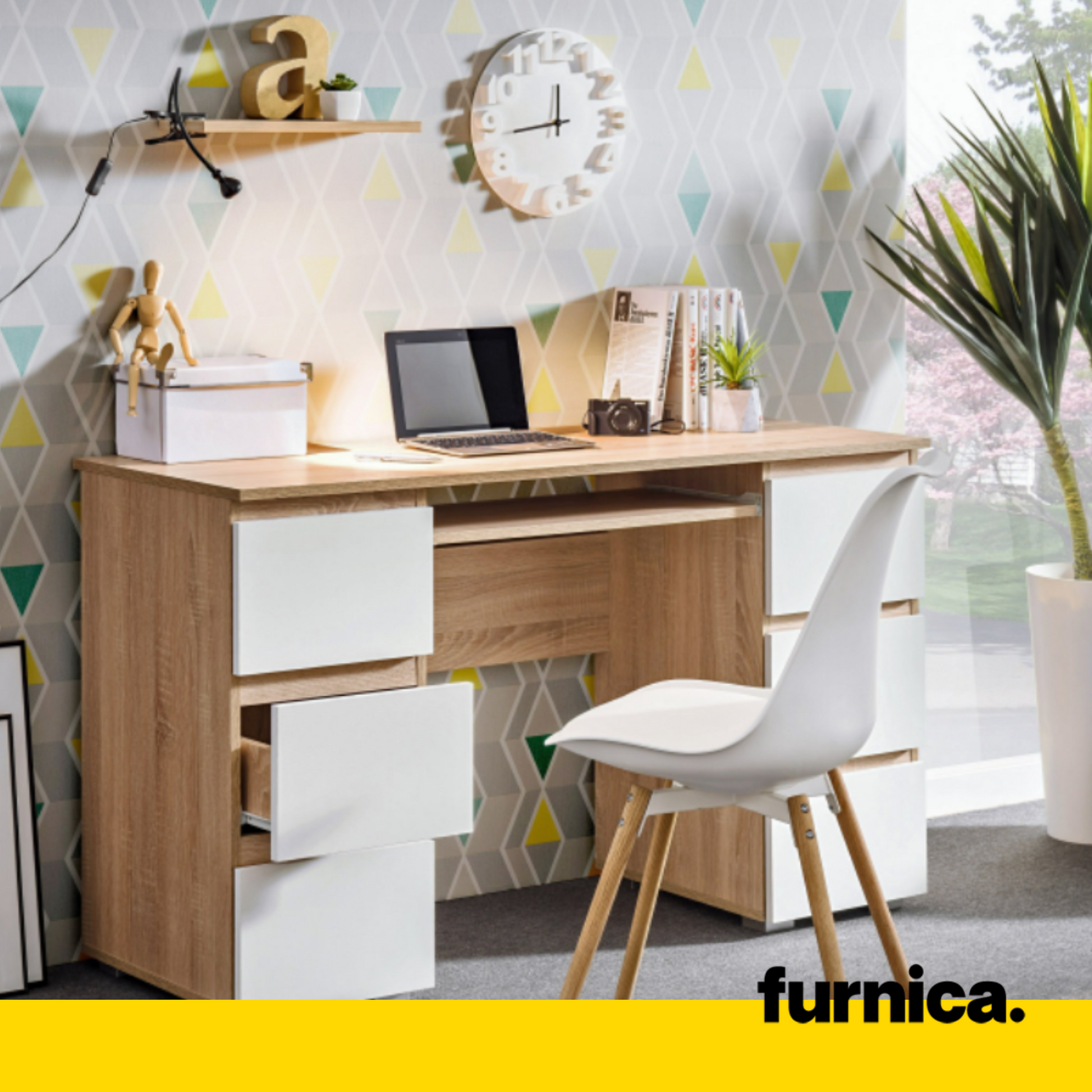 Computertisch CUBA mit sechs Schubladen - SONOMA EICHE/WEISS