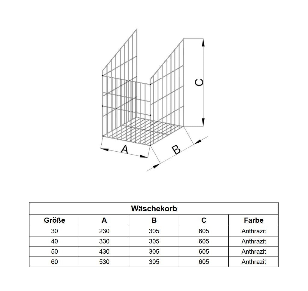 Unser neuer faltbarer Wäschekorb wird eine gute Lösung für Sie und Ihr Badezimmer sein. Er ist für einen Schrank mit einer Breite von 400 mm (40 cm) geeignet. Dieser praktische Wäschekorb ist 605 mm hoch, 330 mm breit und 305 mm tief. Er ist aus einem hochwertigen Stahldraht gefertigt, der mit hochwertigem Zink beschichtet ist. Die Konstruktion dieses funktionellen Wäschekorbs ist äußerst haltbar und stabil. Er wird sicherlich ein langes Leben an Ihrer Seite verbringen.