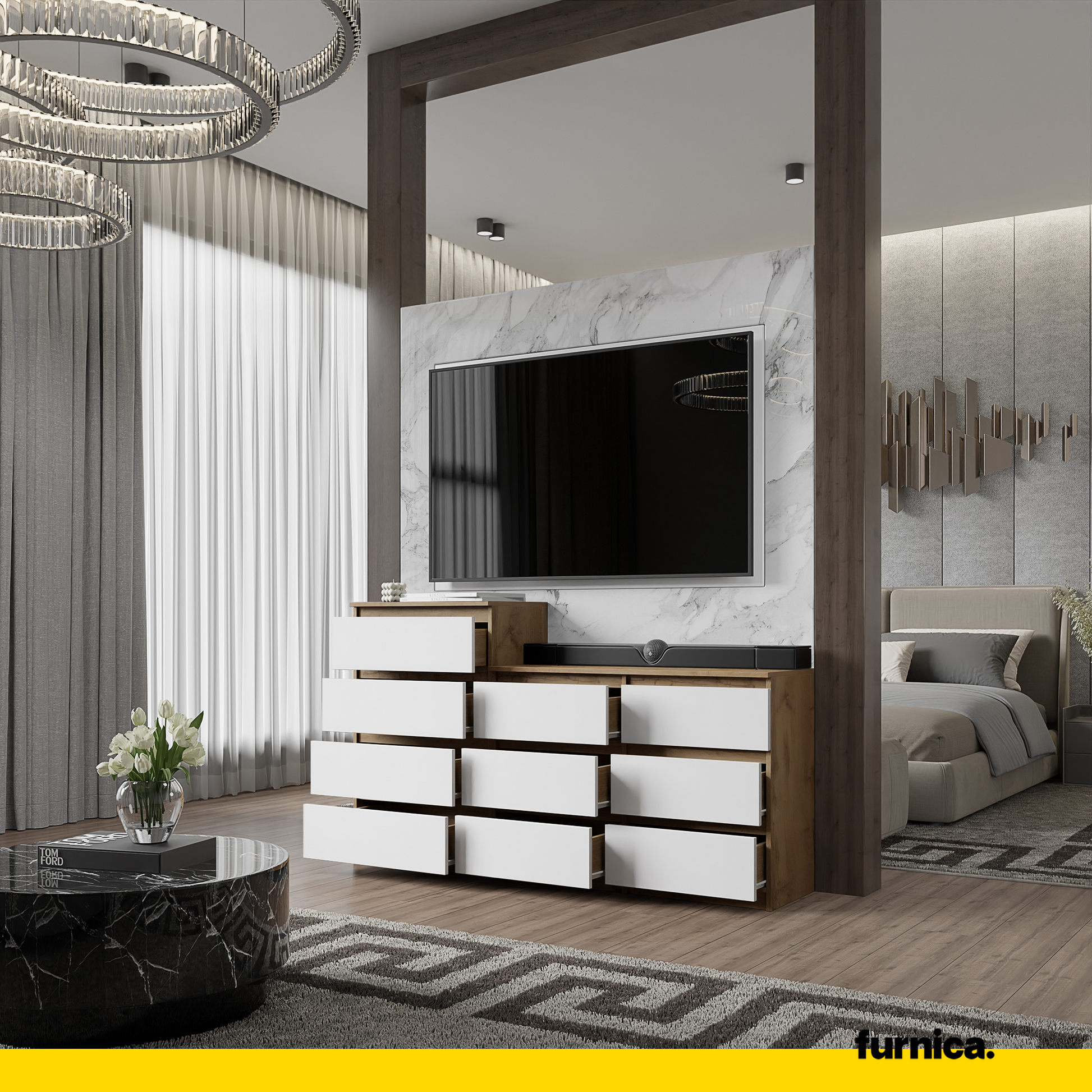 GABRIEL - Kommode mit 10 Schubladen (6+4) - Schlafzimmer Kommode Aufbewahrungsschrank - Wotan Eiche / Weiß Matt H92/70cm B160cm T33cm
