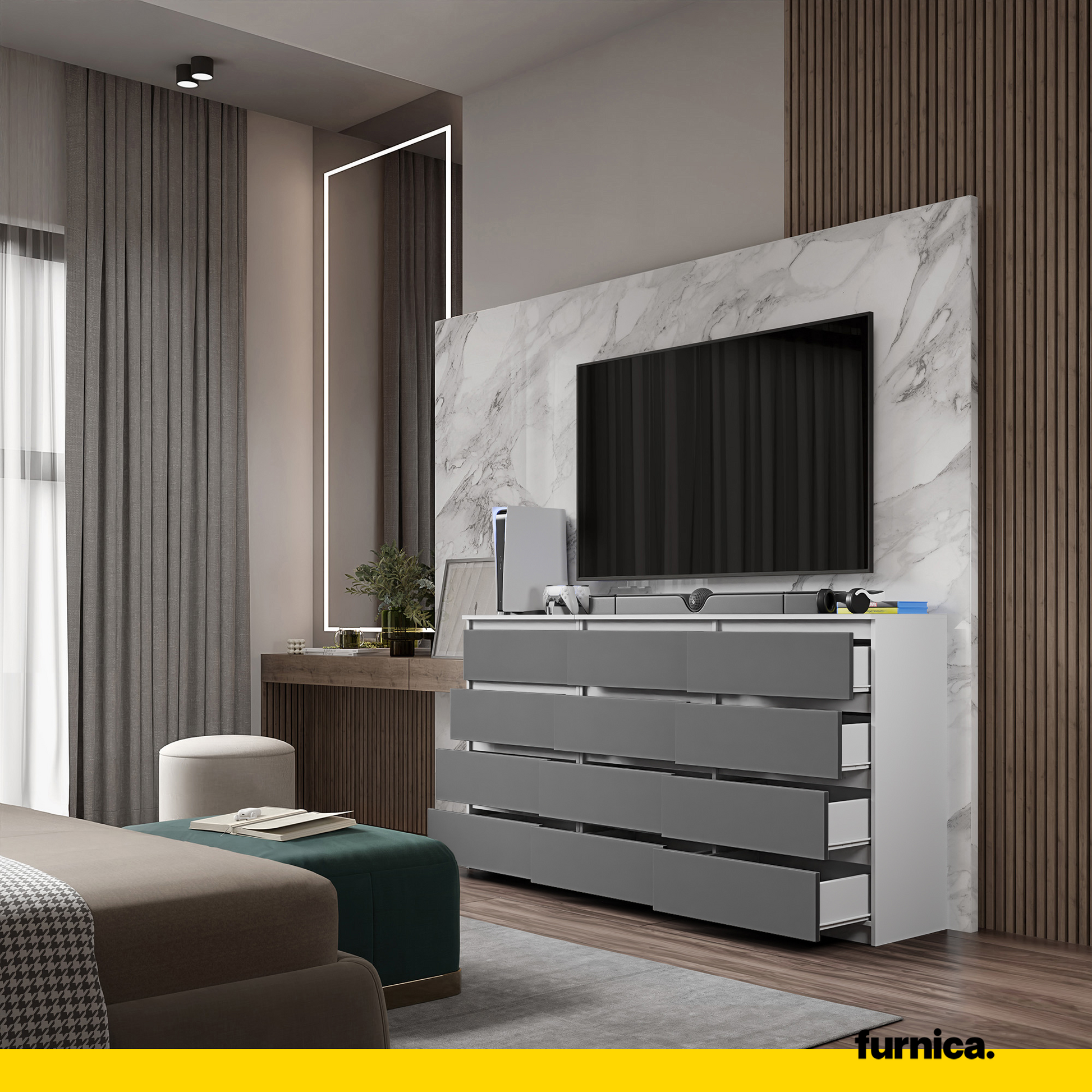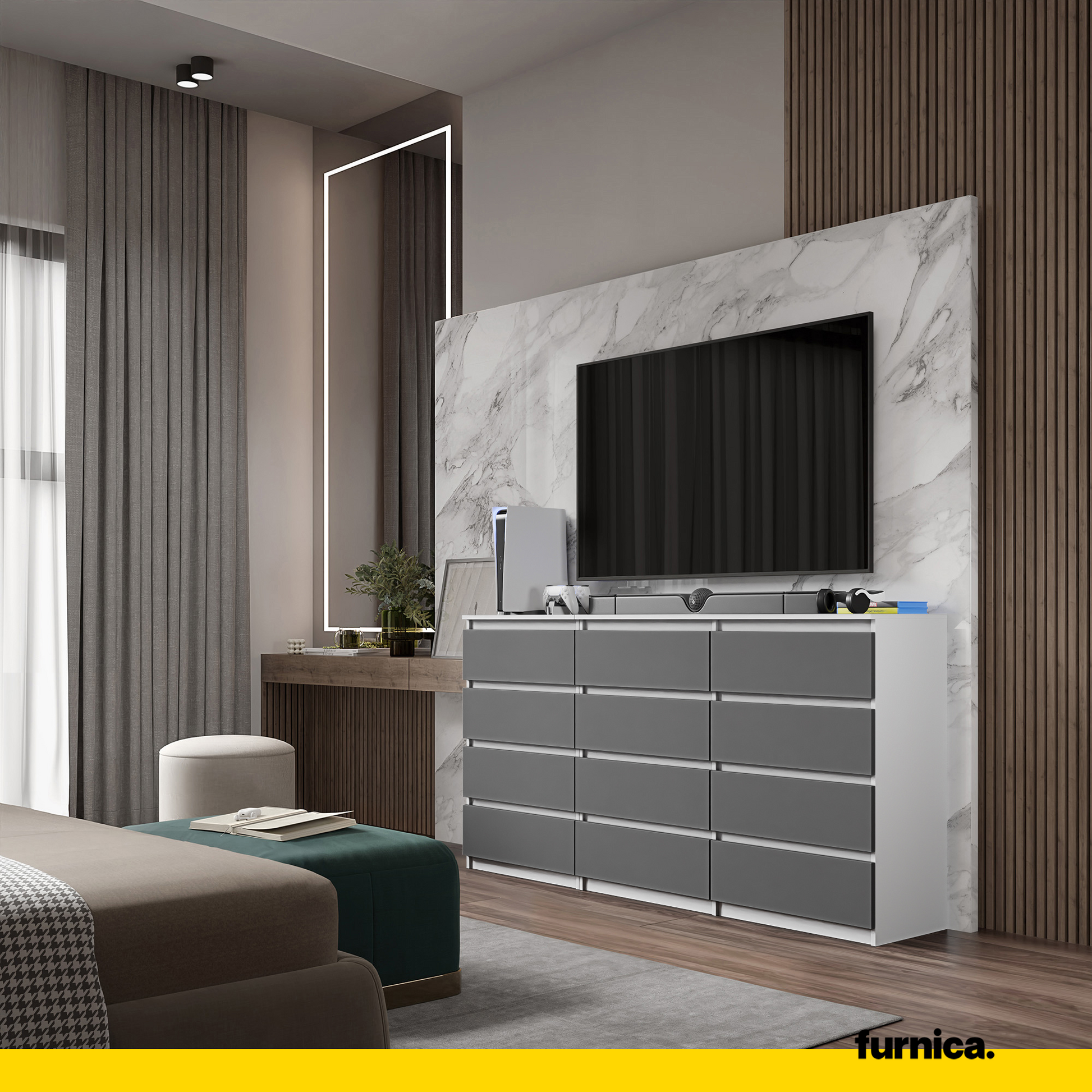 GABRIEL - Kommode / Sideboard mit 12 Schubladen (8+4) - Weiß Matt / Anthrazit H92cm B180cm T33cm