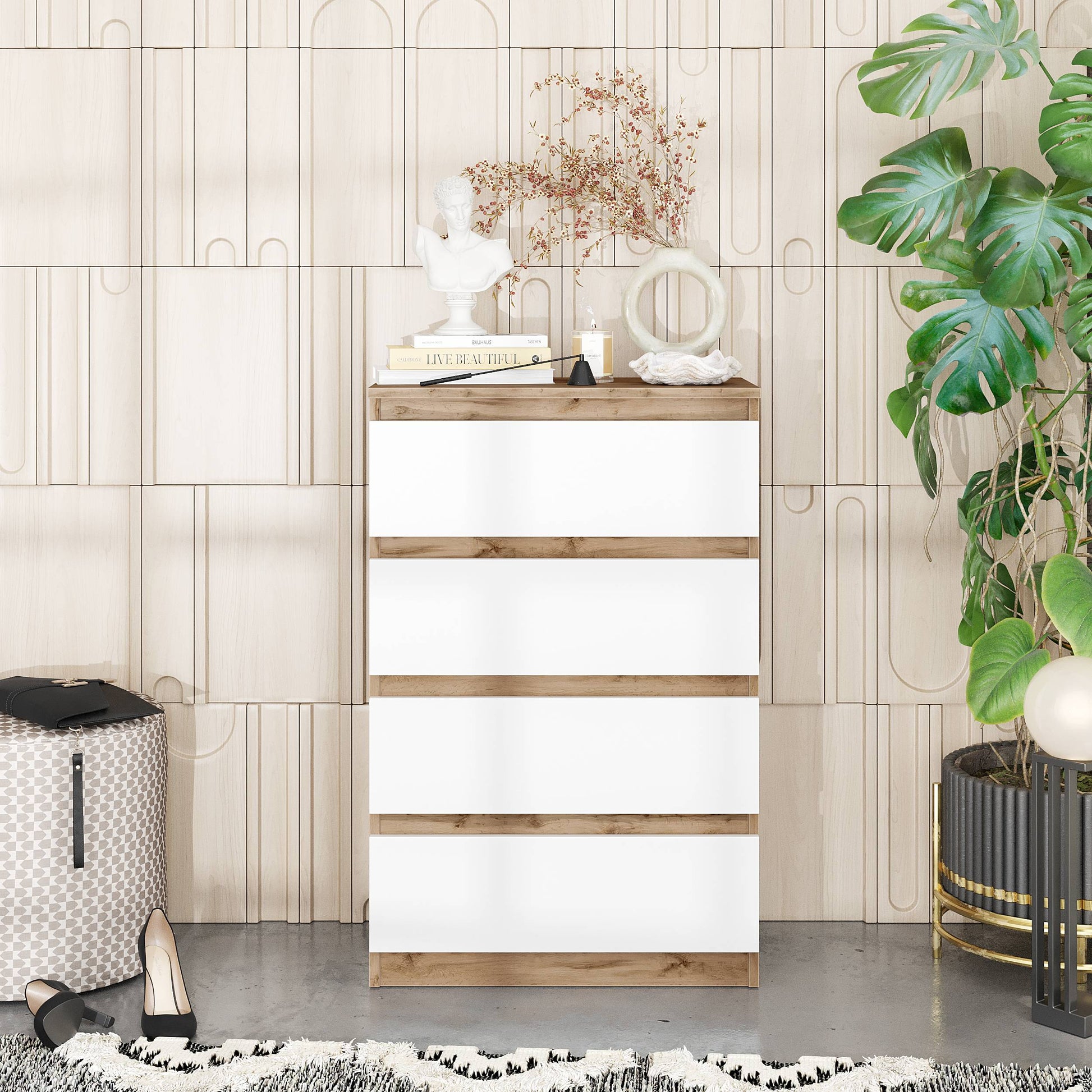 Unser günstiges Möbelstück ist ein perfekter Aufbewahrungsort für alle Ihre Dinge. Ein kleiner Schrank dieser Art ist mit vier geräumigen Schubladen ausgestattet, die Sie mit Ihren Sachen füllen können. Sie können dieses moderne Möbel im Schlafzimmer, im Wohnzimmer oder im Flur aufstellen - es bleibt Ihnen überlassen, und Sie werden sicher einen guten Platz dafür finden. Das schlichte, klassische und universelle Design wird es Ihnen sicher noch leichter machen. Wenn Sie eine zeitlose und frische Einrichtung wünschen, wird diese vielseitige Kommode der Schlüssel sein.