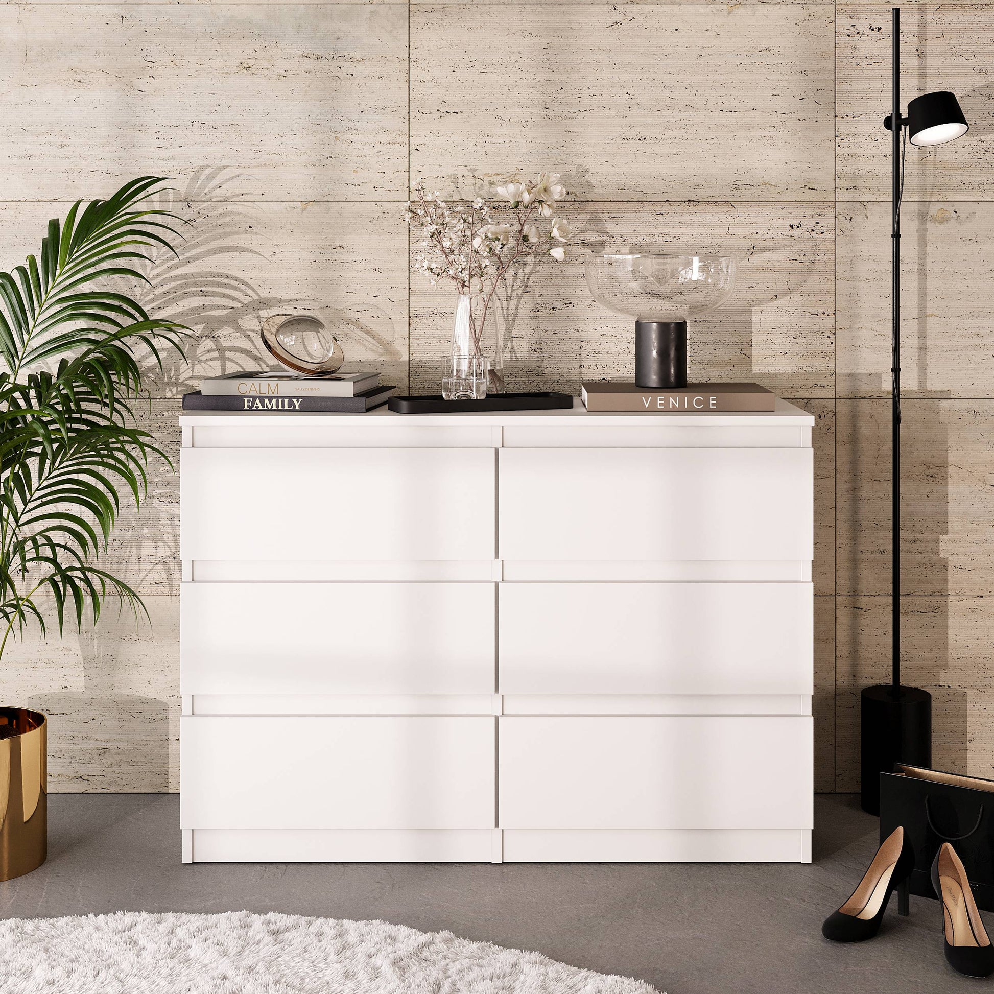 Eine Kommode mit sechs Schubladen ist nicht nur von der technischen Seite her gut. Sie hat auch eine starke optische Seite. Der Schrank ist groß, aber mit seiner hellen, weißen Farbe ist er nicht zu auffällig. Außerdem nimmt er nicht viel Platz weg. Wo auch immer Sie ihn aufstellen wollen, Sie werden mit dem Endergebnis sicher zufrieden sein. Wenn man ein so großes Möbelstück hat, ist es viel einfacher, die Ordnung im Haus aufrechtzuerhalten - denn man kann alles darin verstecken, so dass die nicht benötigten Dinge nicht überall herumliegen.