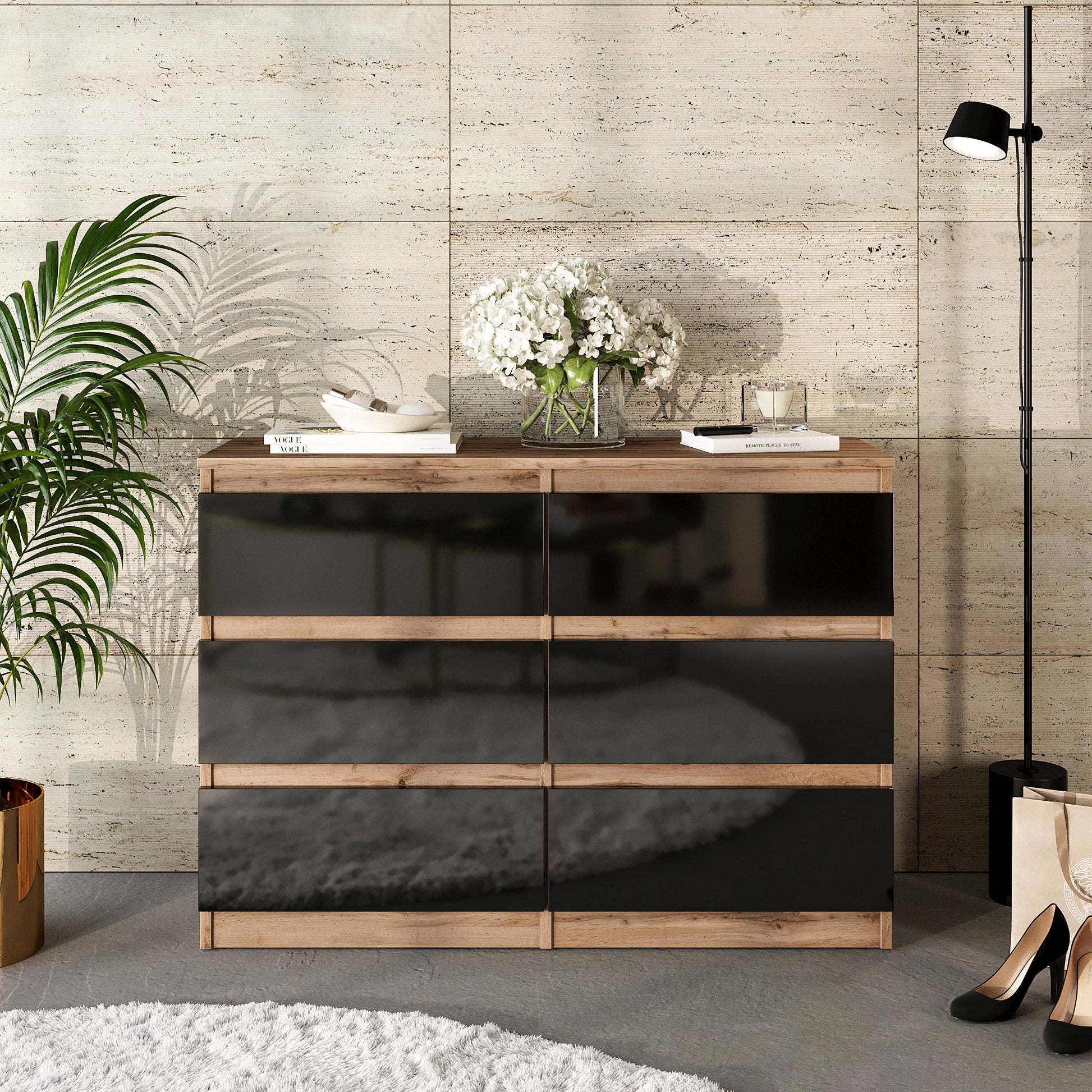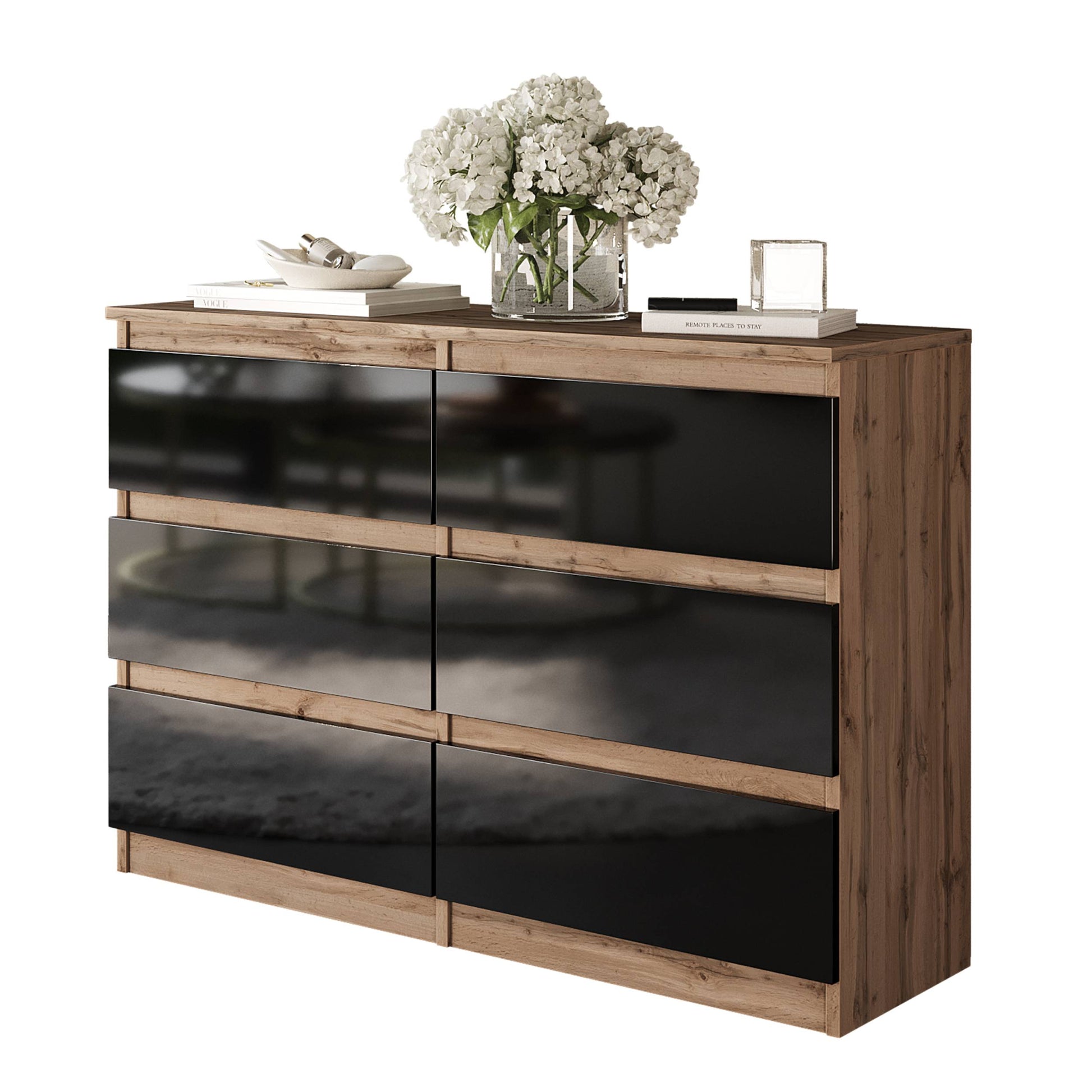 GABRIEL - Kommode / Sideboard mit 6 Schubladen - Wotan Eiche / Schwarz Gloss H71cm B100cm TD33cm