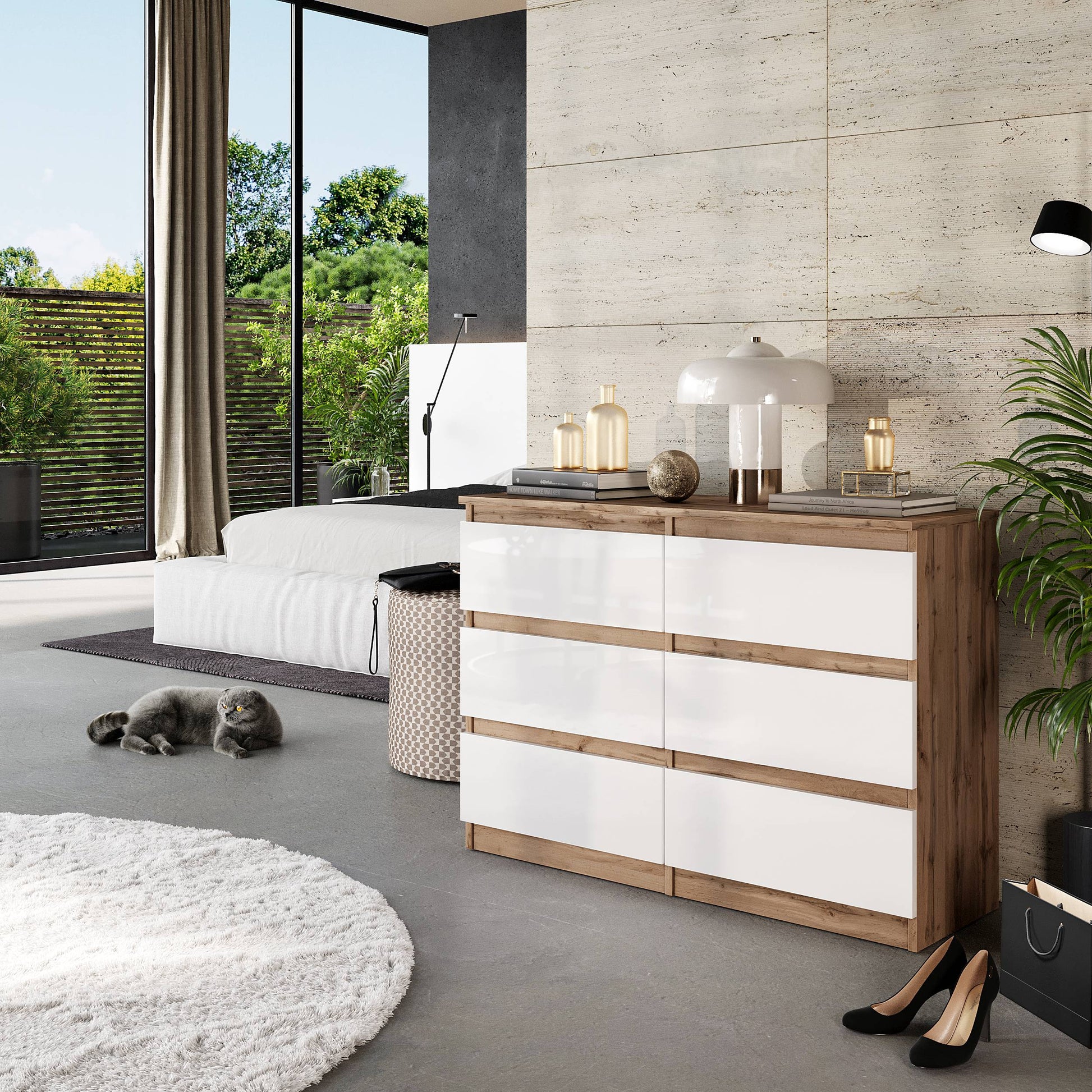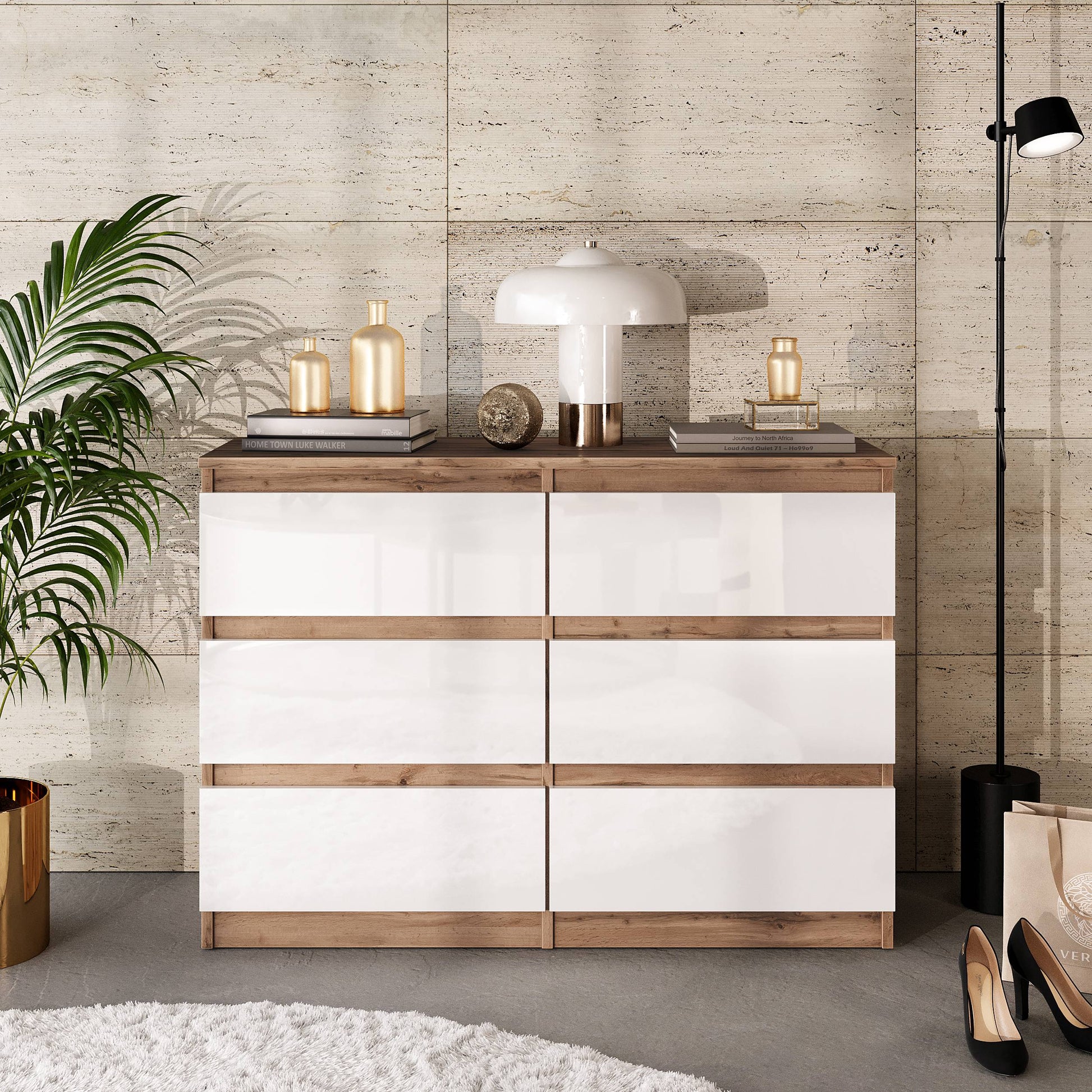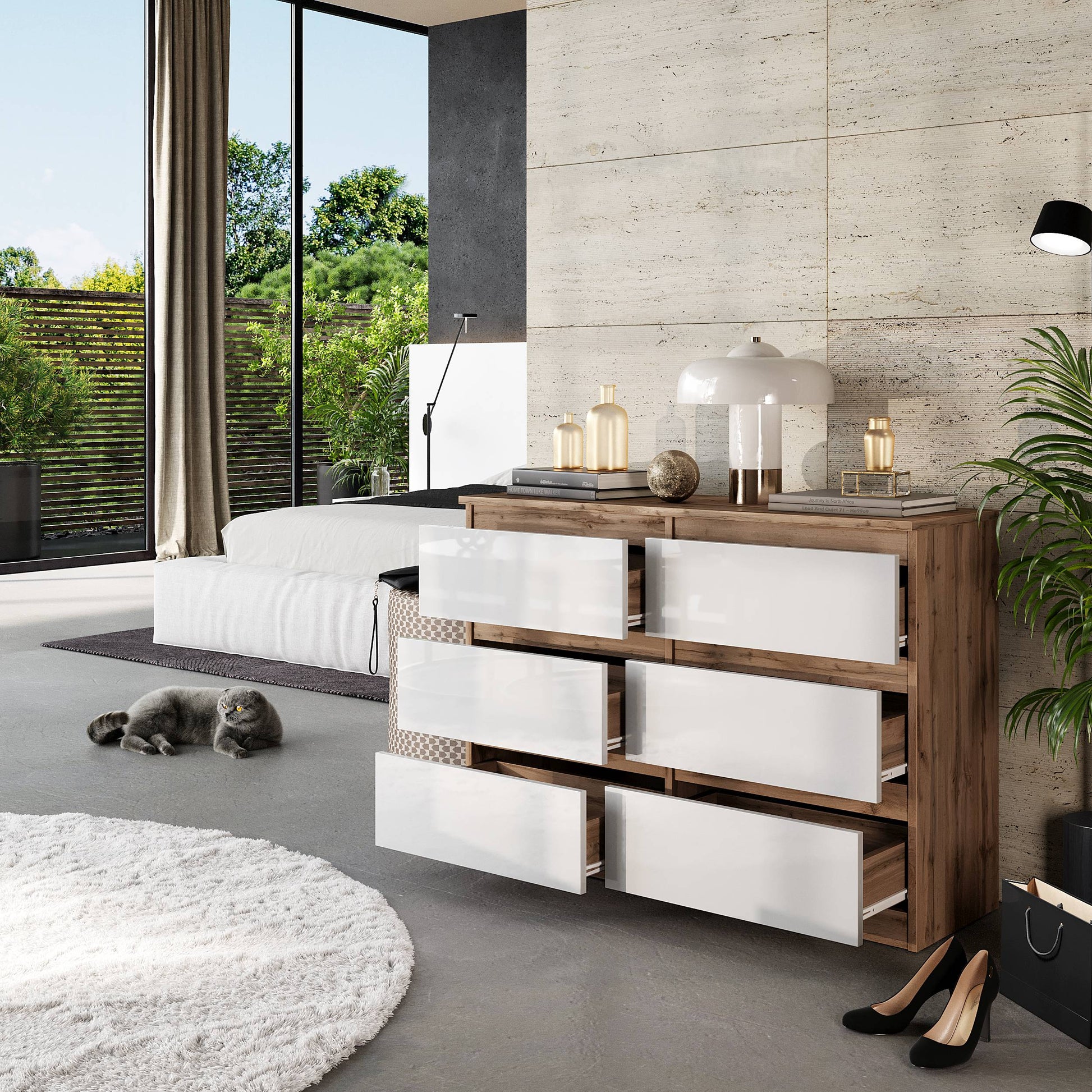 GABRIEL - Kommode / Sideboard mit 6 Schubladen - Wotan Eiche / Weiß Gloss H71cm B100cm TD33cm
