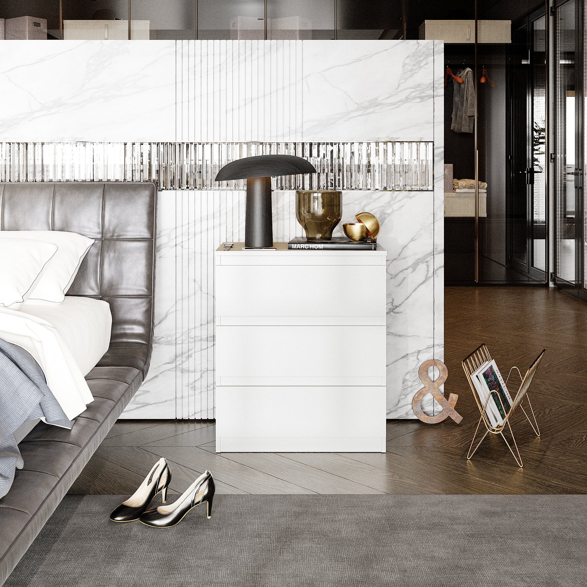 Das matte Weiß verleiht dem Möbelstück Leichtigkeit und lässt den Raum optisch größer und heller wirken. Diese universelle Farbe lässt sich mühelos mit jeder Einrichtung kombinieren – von Pastelltönen bis hin zu kräftigen Kontrasten. Ein kompaktes und zugleich stilvolles Möbelstück, das Ihr Schlafzimmer auffrischt und ihm eine ruhige, ästhetische Note verleiht.