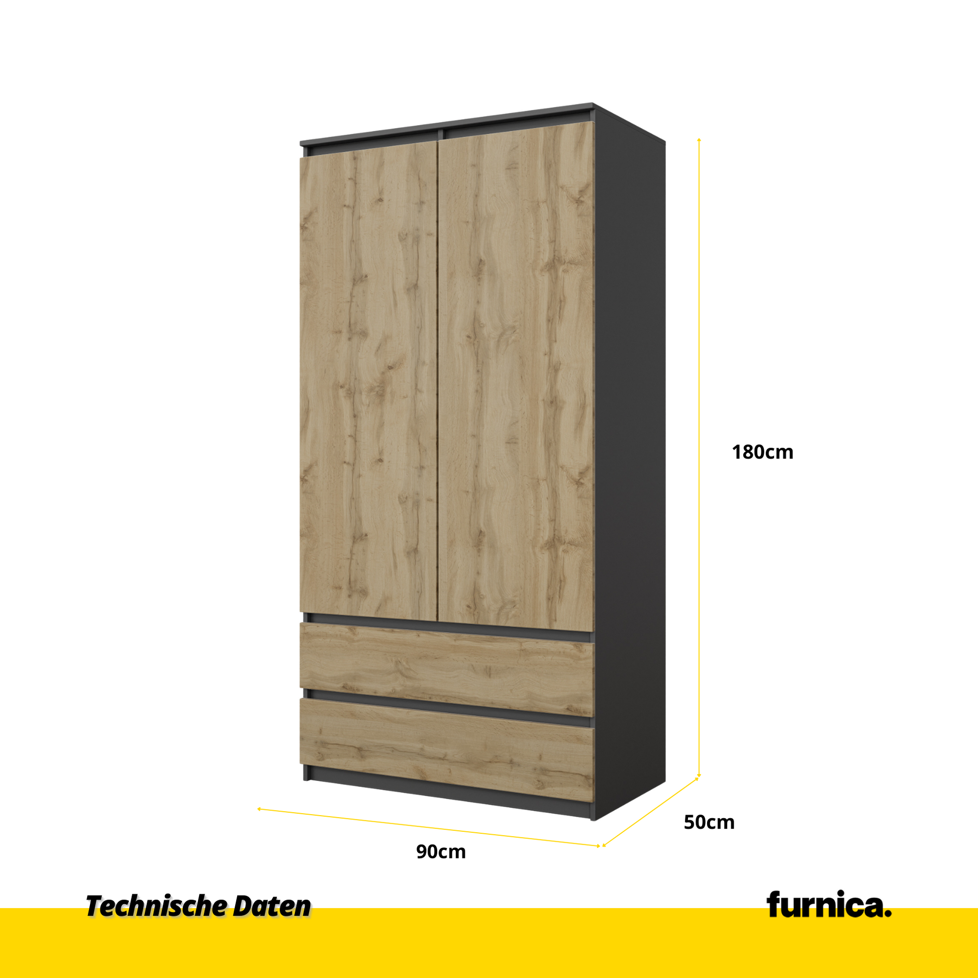 Wenn Sie auf der Suche nach einem einzigartigen, originellen Möbelstück mit schlichtem Design sind, hier ist unser neuer Kleiderschrank JOELLE. Die Farbkombination aus Anthrazit und Wotan-Eiche wird sicher nicht langweilig, auch nicht nach einigen Jahren des Gebrauchs. So ein moderner Schrank lässt Ihr Schlafzimmer immer frisch und stilvoll aussehen. Ihr Interieur wird zweifelsohne sehr gut ergänzt werden. Und Sie haben wirklich viel Platz für Ihre Kleidung und Wäsche!