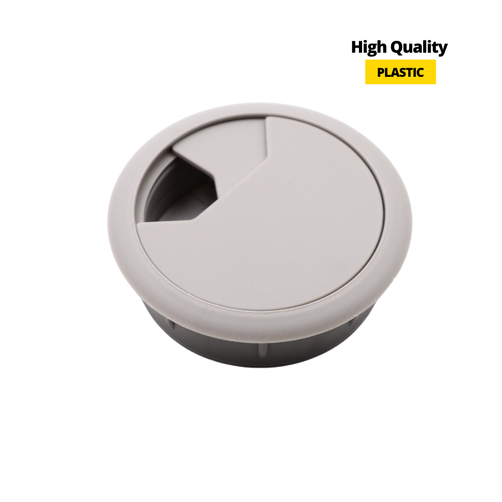 Die graue Kabeltülle ist ein Produkt für Möbel. Sie können sie problemlos in eine Öffnung in Ihrem Schreibtisch oder in Ihrer Küchenarbeitsplatte einsetzen und Kabel von nahe gelegenen Elektrogeräten durch sie führen. Auf diese Weise können Sie die Stromkabel verstecken und ästhetisch anordnen und gleichzeitig die Ergonomie der Arbeit oder die Sicherheit der Geräte verbessern.