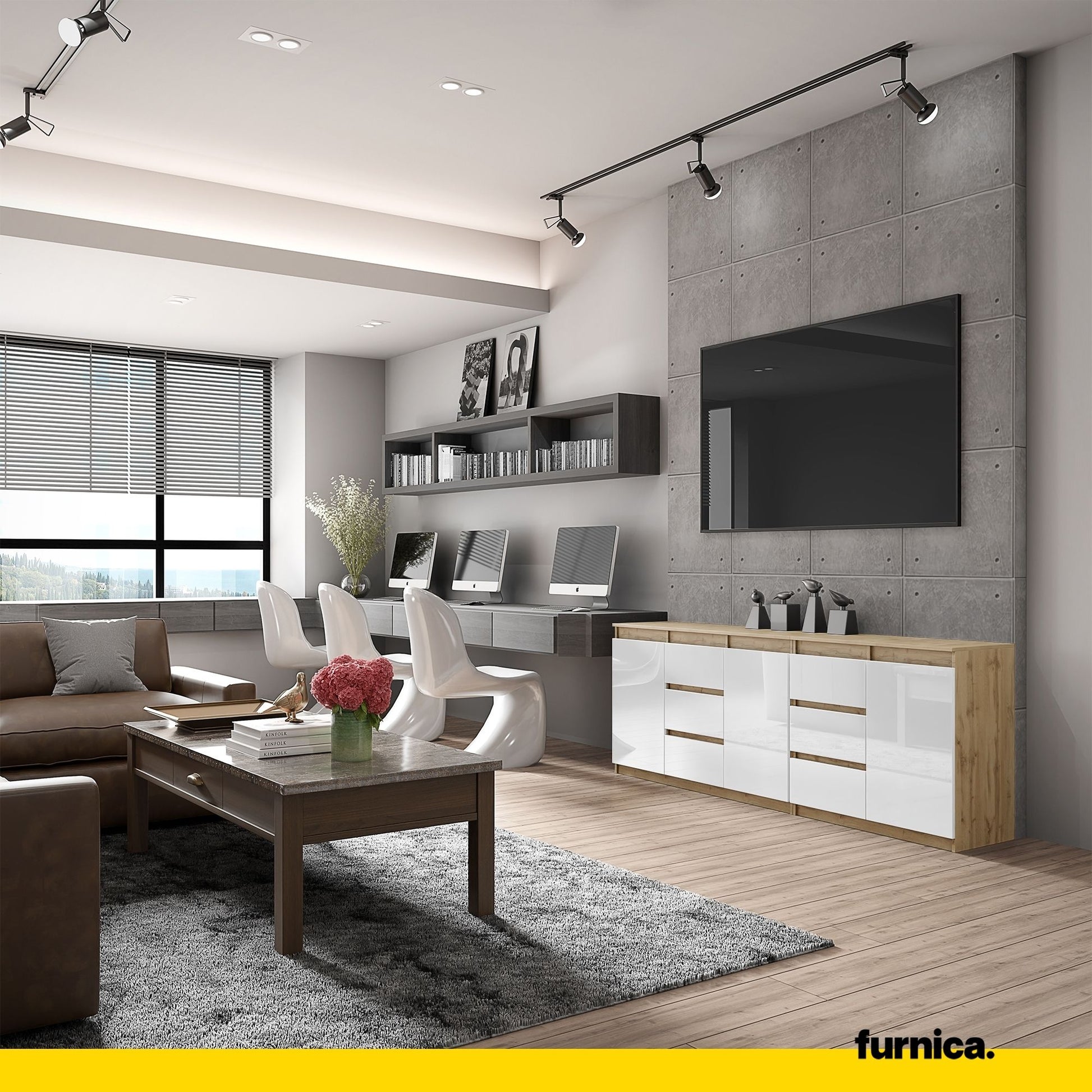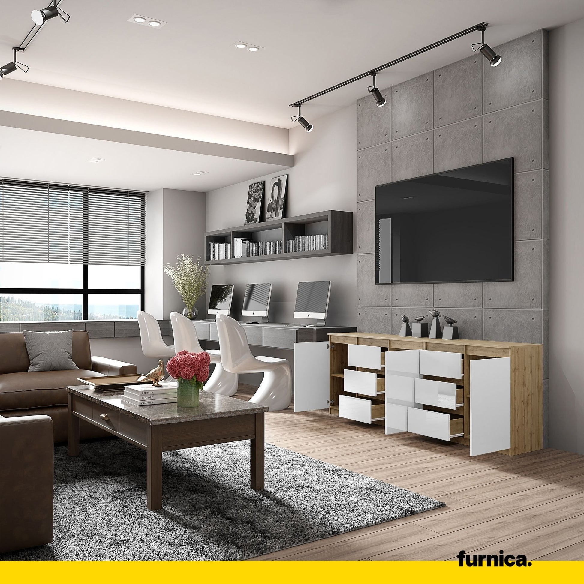 MIKEL - Kommode mit 6 Schubladen und 3 Türen - Schlafzimmer-Kommode, Stauraum-Schrank, Sideboard - Wotan Eiche / Weiß Hochglanz H75cm B200cm T35cm