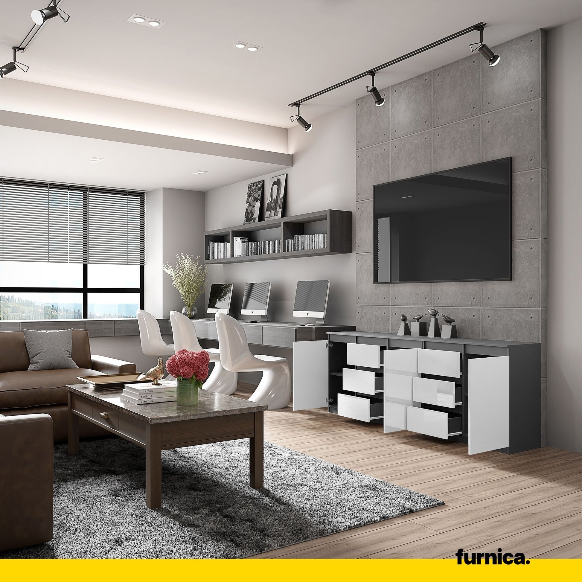 MIKEL - Kommode mit 6 Schubladen und 3 Türen - Schlafzimmer-Kommode, Stauraum-Schrank, Sideboard - Anthrazit / Weiß Hochglanz H75cm B200cm T35cm