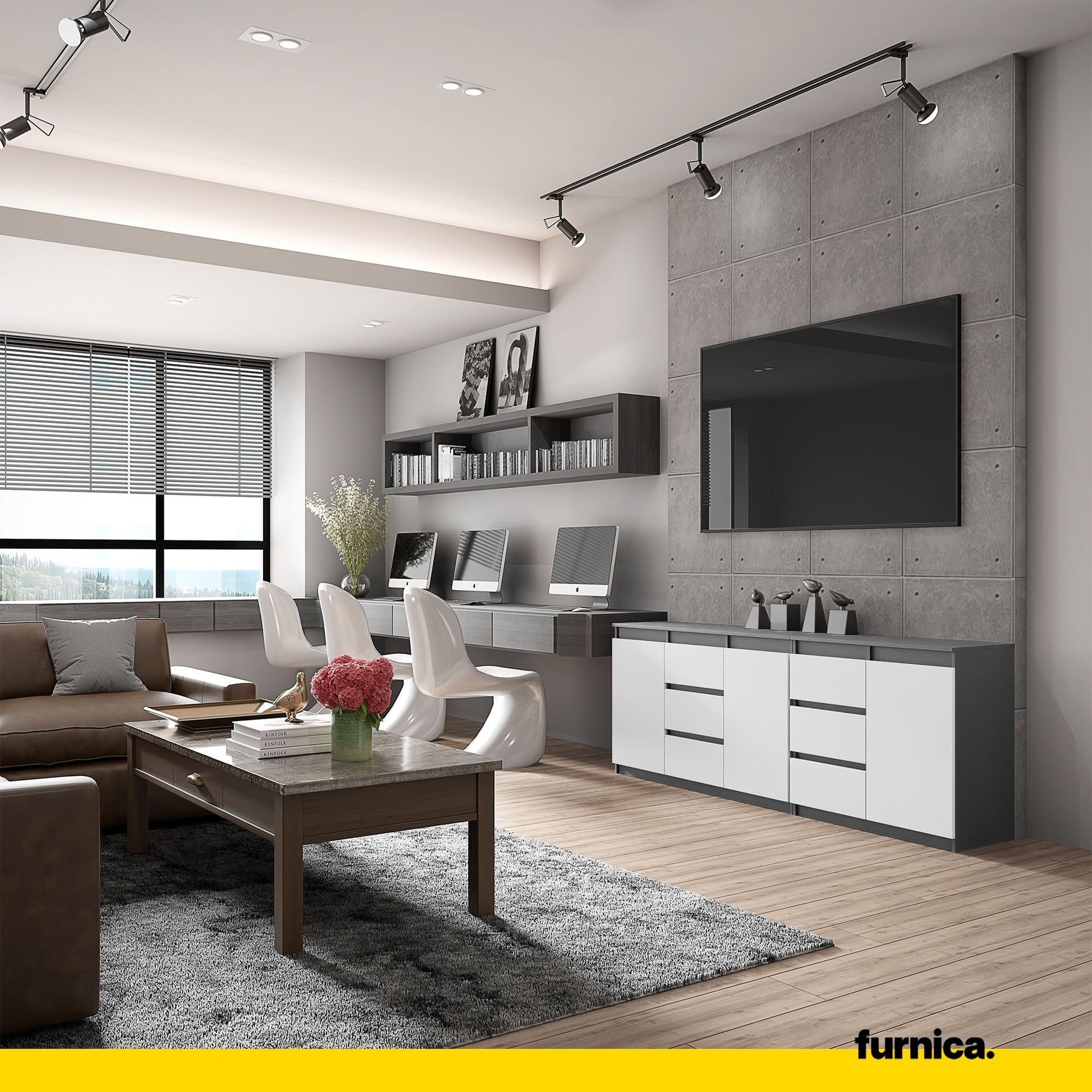Eine moderne Kommode wird sicherlich eine großartige Ergänzung für Ihr Interieur sein. Besonders eine wie diese. Der anthrazitfarbene Korpus und die weißen Mattfronten harmonieren perfekt miteinander. Die Kombination der Farben ist äußerst klassisch, elegant, vielseitig und stilvoll. Mit einem so frischen Stil werden Sie sicherlich ein langfristiges Interieur genießen. Ganz zu schweigen davon, dass die Kapazität dieses großen Stauraumschrankes beeindruckend ist. Er ist mit 6 geräumigen Schubladen und 3 Türen ausgestattet. Sie werden sich über die Kapazität nicht beschweren können!