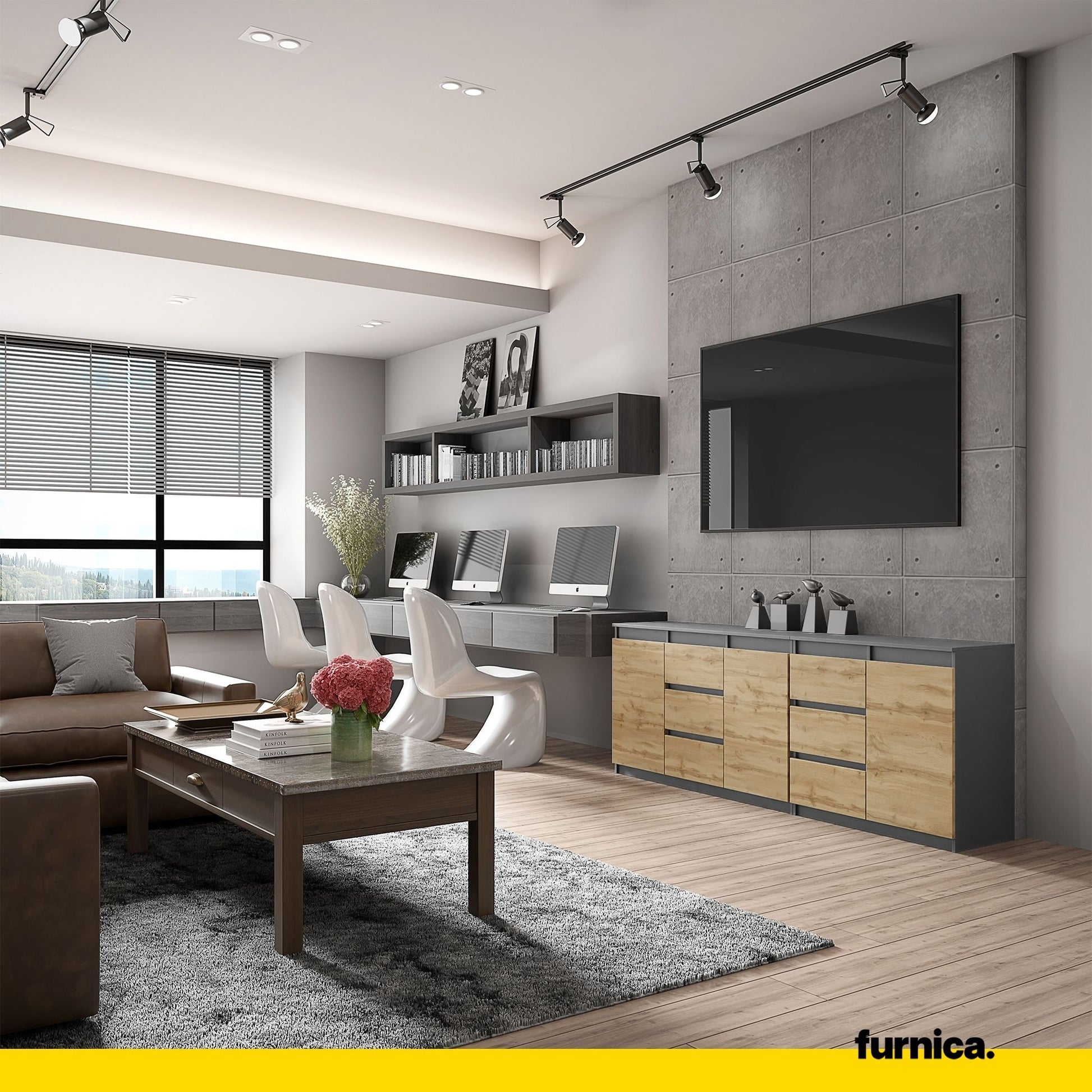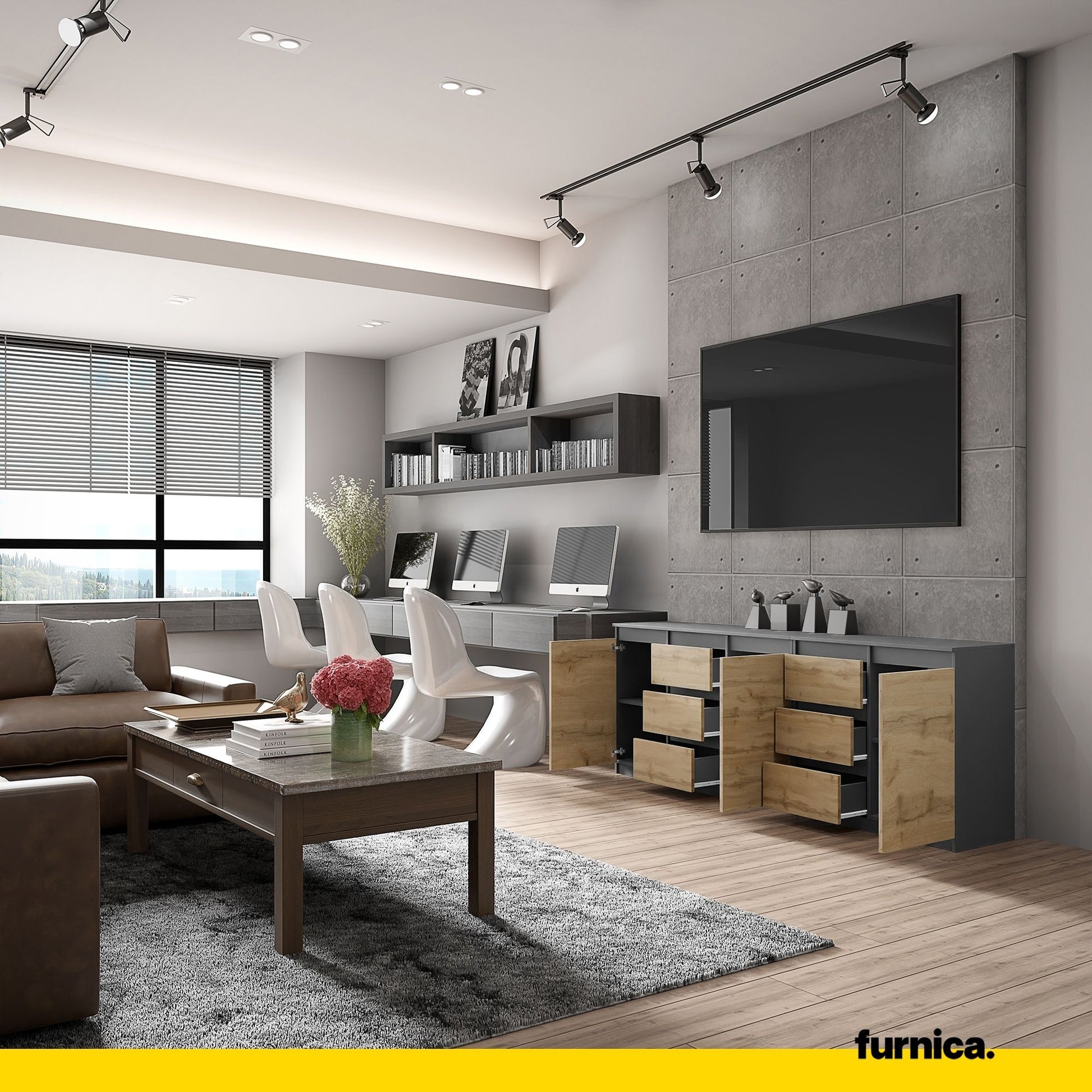 Diese neue Kommode gehört zu den Möbelstücken, die unsere Kunden wirklich lieben. Der anthrazitfarbene Korpus und die Fronten in Wotan Eiche verleihen einen eleganten und klassischen Touch. Ein so frischer Stil wird Ihnen sicherlich lange Freude bereiten. Darüber hinaus ist dieser große Stauraumschrank mit 6 geräumigen Schubladen und 3 Türen ausgestattet, sodass viel Platz für all Ihre Dinge vorhanden ist. Sie können dieses praktische Sideboard im Wohnzimmer oder in jedem anderen Raum aufstellen, den Sie wünschen und benötigen. Mit einer funktionalen Kommode wie dieser sind Ihnen die Möglichkeiten unbegrenzt.