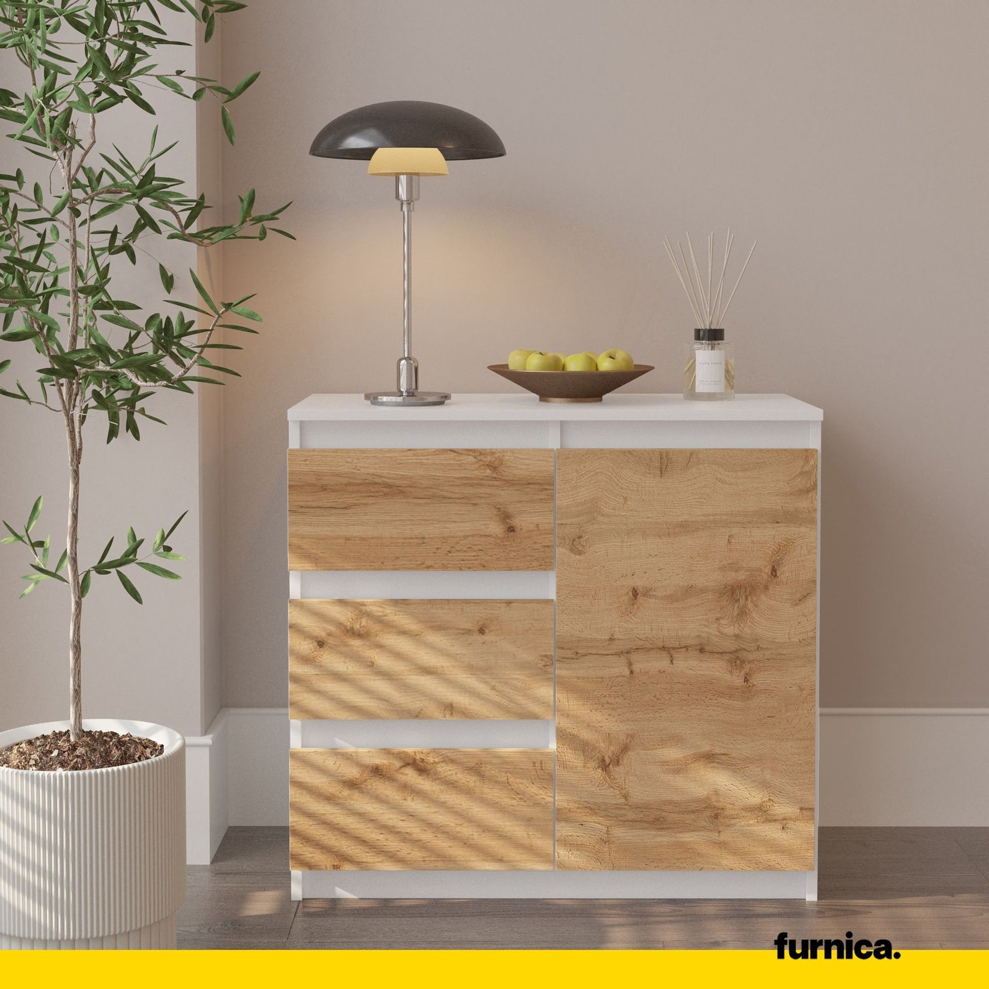 Sideboard MIKEL mit 3 Schubladen - Weiß und Eiche Wotan