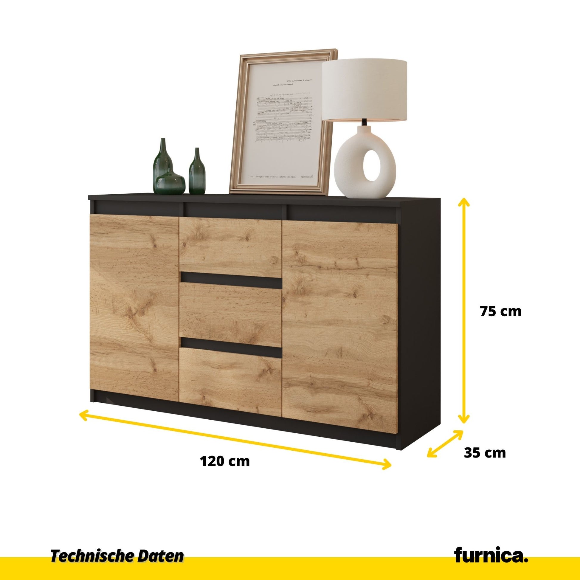 Wenn Sie von einer originellen Einrichtung träumen, die Ihre Familie oder andere Gäste beeindruckt, dann sollten Sie vielleicht unser Sideboard MIKEL ausprobieren, das eine einzigartige Farbkombination aus Schwarz und Wotan aufweist. Es ist stilvoll, zart, frisch - alles, was Sie für Ihre Einrichtung brauchen, um nie aus der Mode zu kommen. Dank des schlichten Designs und dieser beiden Farben müssen Sie sich nicht mehr vor neuen Trends fürchten, die ständig von links und rechts kommen. So sparen Sie sich eine Menge Geld für später!