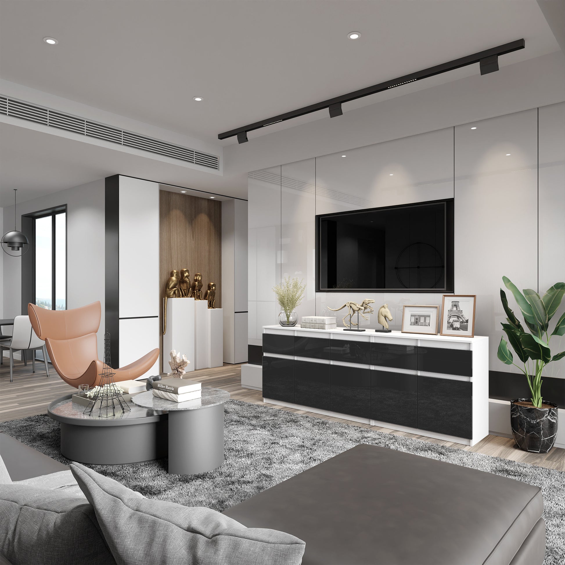 NOAH - Kommode mit 5 Schubladen und 5 Türen - Schlafzimmer-Kommode Aufbewahrungsschrank Sideboard - Weiß Matt / Schwarz Glanz H75cm B200cm T35cm