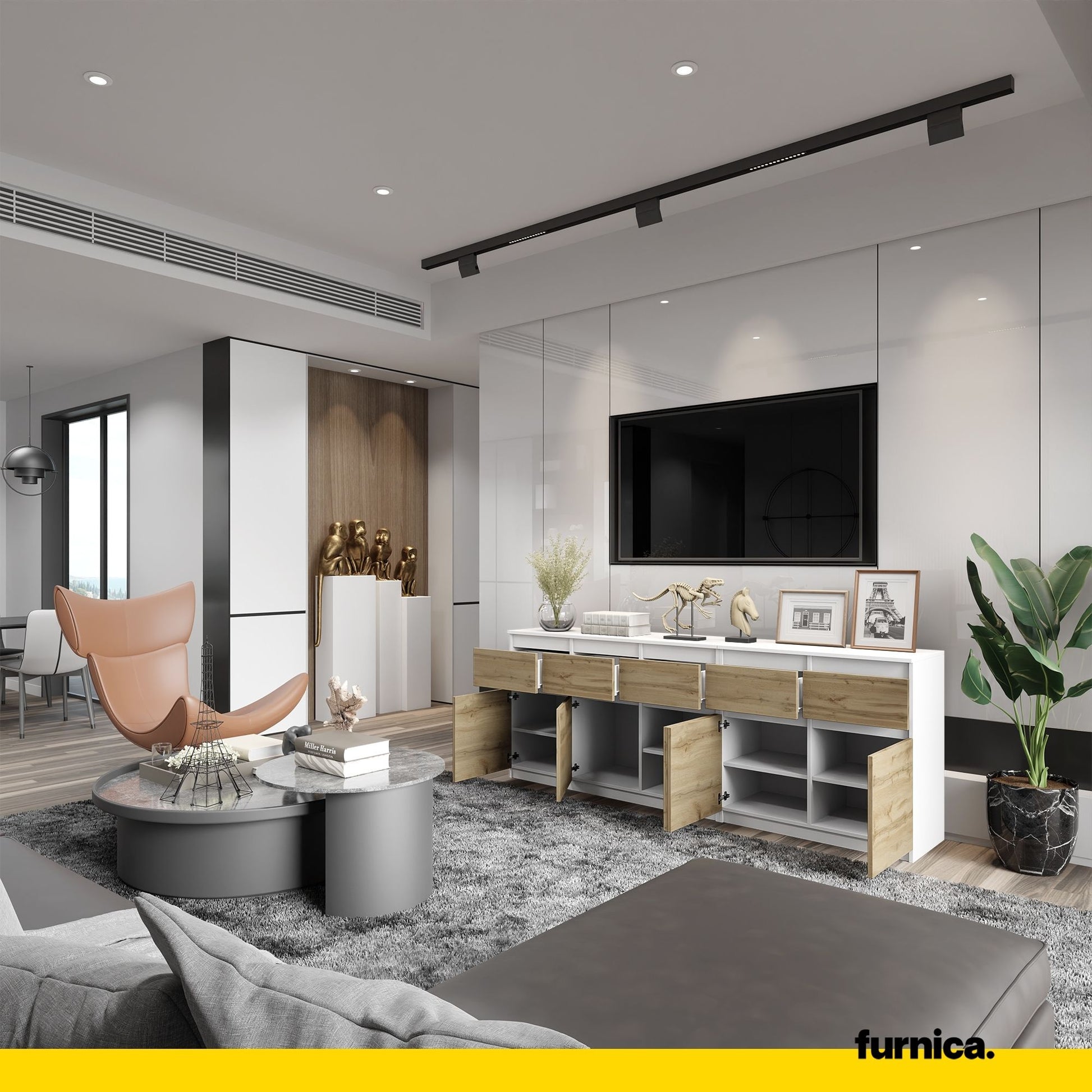 NOAH - Kommode mit 5 Schubladen und 5 Türen - Schlafzimmer-Kommode Aufbewahrungsschrank Sideboard - Weiß Matt / Wotan Eiche H75cm B200cm T35cm