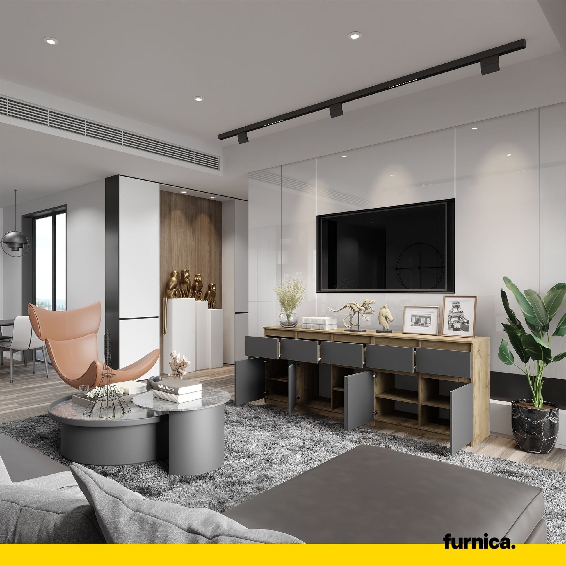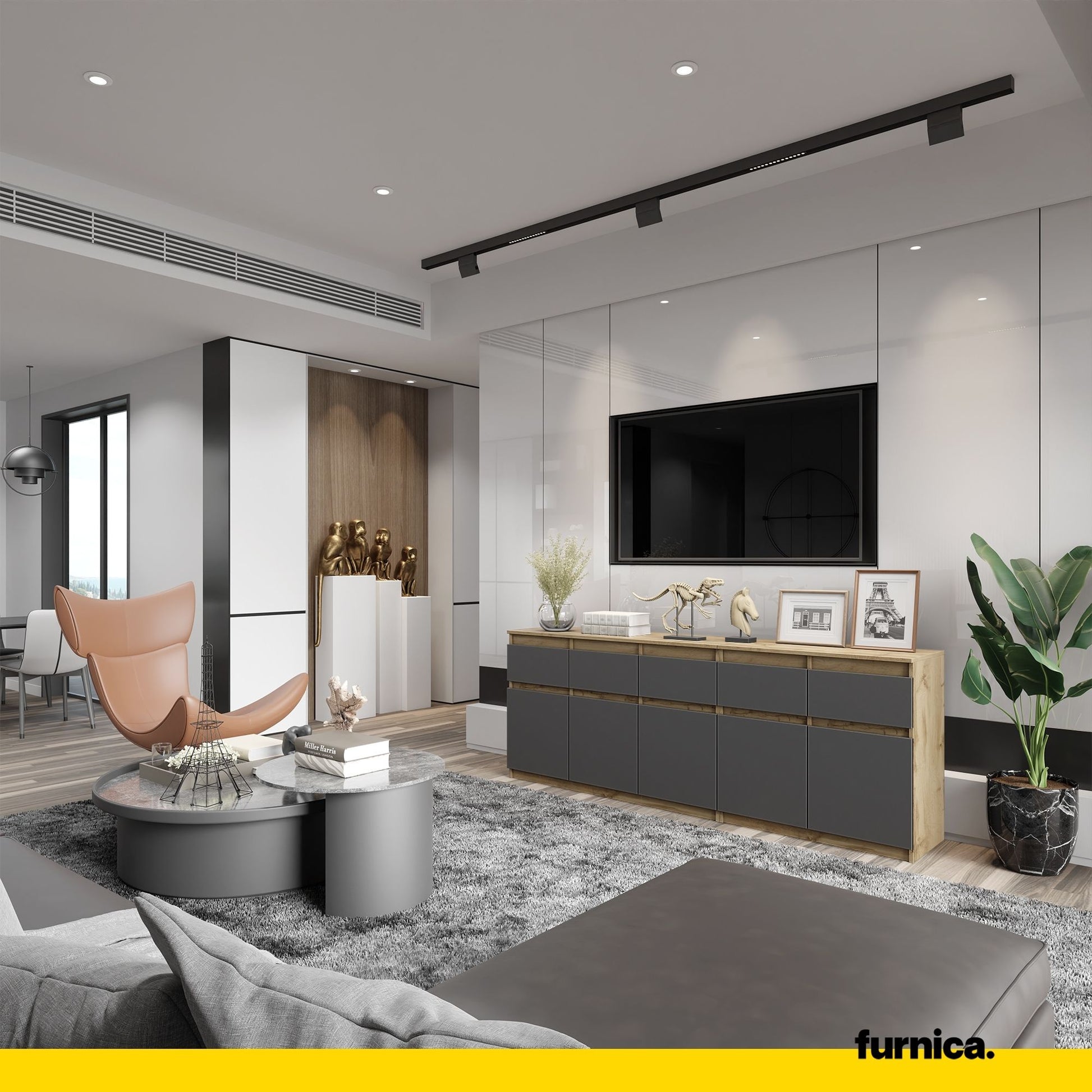 Eine nützliche Kommode wie diese wird auch eine gute Ergänzung für Ihr Interieur sein. Der Wotan Eiche Korpus und die Anthrazit Fronten harmonieren hervorragend miteinander und verleihen Ihnen einen frischen und einzigartigen Stil. Moderne Möbelstücke von uns enttäuschen nie, wenn es um ihre Optik geht, und Sie können sich sicher sein, dass ein so origineller Stil Ihnen lange Zeit Freude bereiten wird. Jedes Haus braucht ein universelles Möbelstück, und dieser große Aufbewahrungsschrank ist eine perfekte Wahl für Ihr Zuhause.
