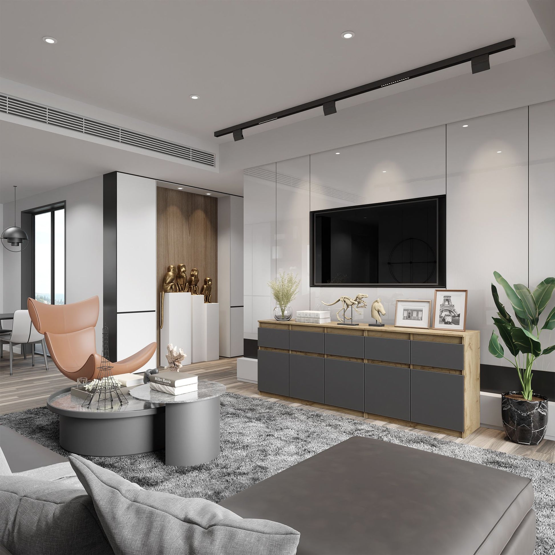 Diese neue Kommode ist mit 5 geräumigen Schubladen und 5 Türen ausgestattet. Sie wurde in jedem einzelnen Detail verfeinert, sodass sowohl die Bauqualität als auch die Optik perfekt sind. Dieses praktische Sideboard wurde aus dickem, melaminbeschichtetem Spanplattenmaterial und hochdichter Faserplatte gefertigt, wodurch die Materialien sehr stark und langlebig sind und der funktionalen Kommode eine solide und stabile Konstruktion gewährleistet wird.
