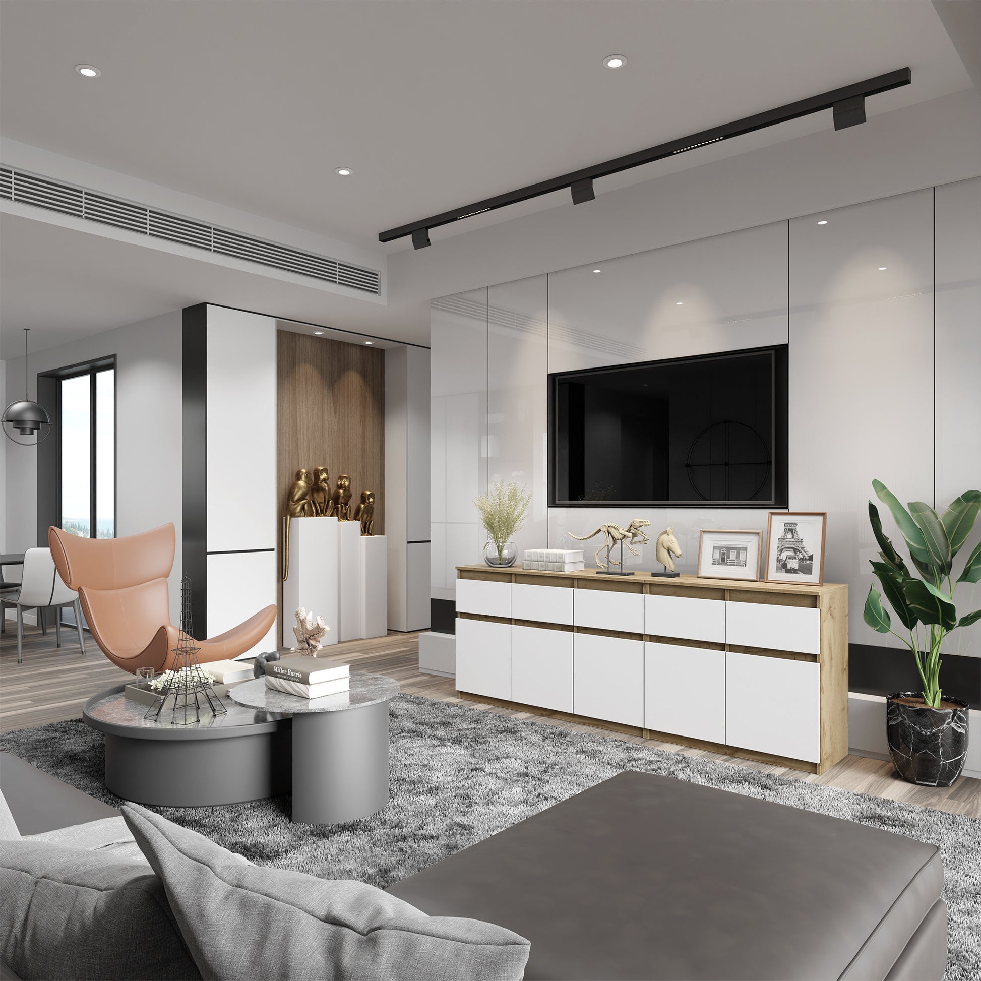 Diese moderne Kommode wird auch eine gute Ergänzung für Ihr Interieur sein. Der Wotan Eiche Korpus und die weiß matte Fronten wirken sehr schlicht und klassisch. Ein solch frischer Stil ist etwas, das Sie über Jahrzehnte lieben werden, und es wird Ihnen nicht schnell langweilig werden. Außerdem wird ein vielseitiger Stil wie dieser nie altmodisch. Wenn Sie also ein günstiges Möbelstück kaufen möchten, das Ihnen alles bietet, was Sie brauchen, haben wir eines, das all Ihre Erwartungen erfüllen wird!