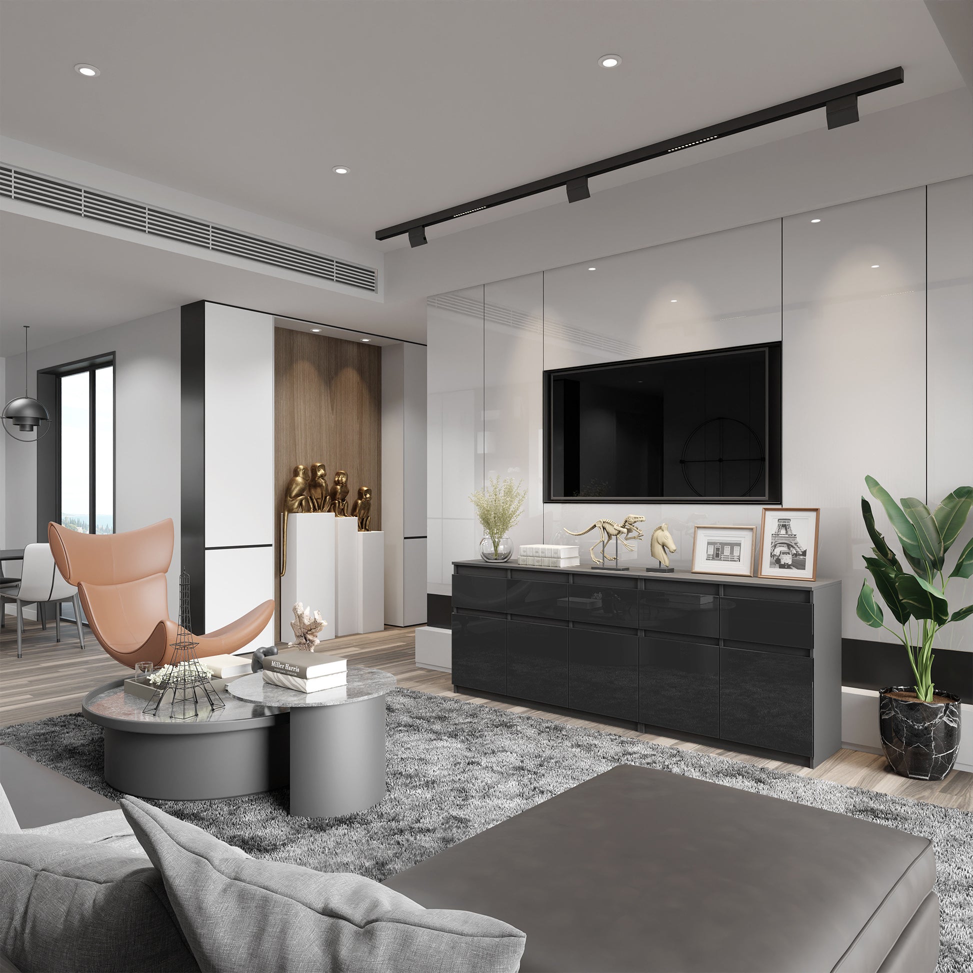 Diese funktionale Kommode wird definitiv eine großartige Ergänzung für Ihr Interieur sein. Der anthrazitfarbene Korpus und die schwarz glänzenden Fronten sind voll von Klasse und Eleganz. Eine einzigartige Farbkombination wie diese wird Ihnen viele Jahre lang Freude bereiten, sodass Sie sich um solche Details keine Sorgen machen müssen. Wir alle brauchen eine nützliche Kommode in unserem Zuhause, und diese wird eine perfekte Wahl sein. Moderne Möbel von uns haben noch keinen unserer Kunden enttäuscht.
