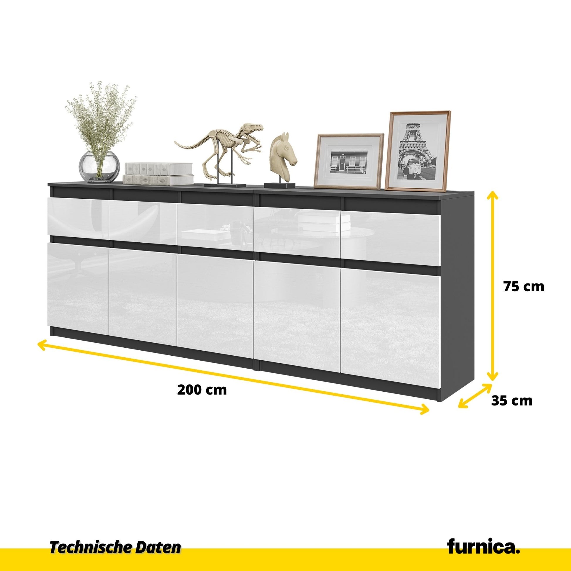 NOAH - Kommode mit 5 Schubladen und 5 Türen - Schlafzimmer-Kommode Aufbewahrungsschrank Sideboard - Anthrazit / Weiß Glanz H75cm B200cm T35cm