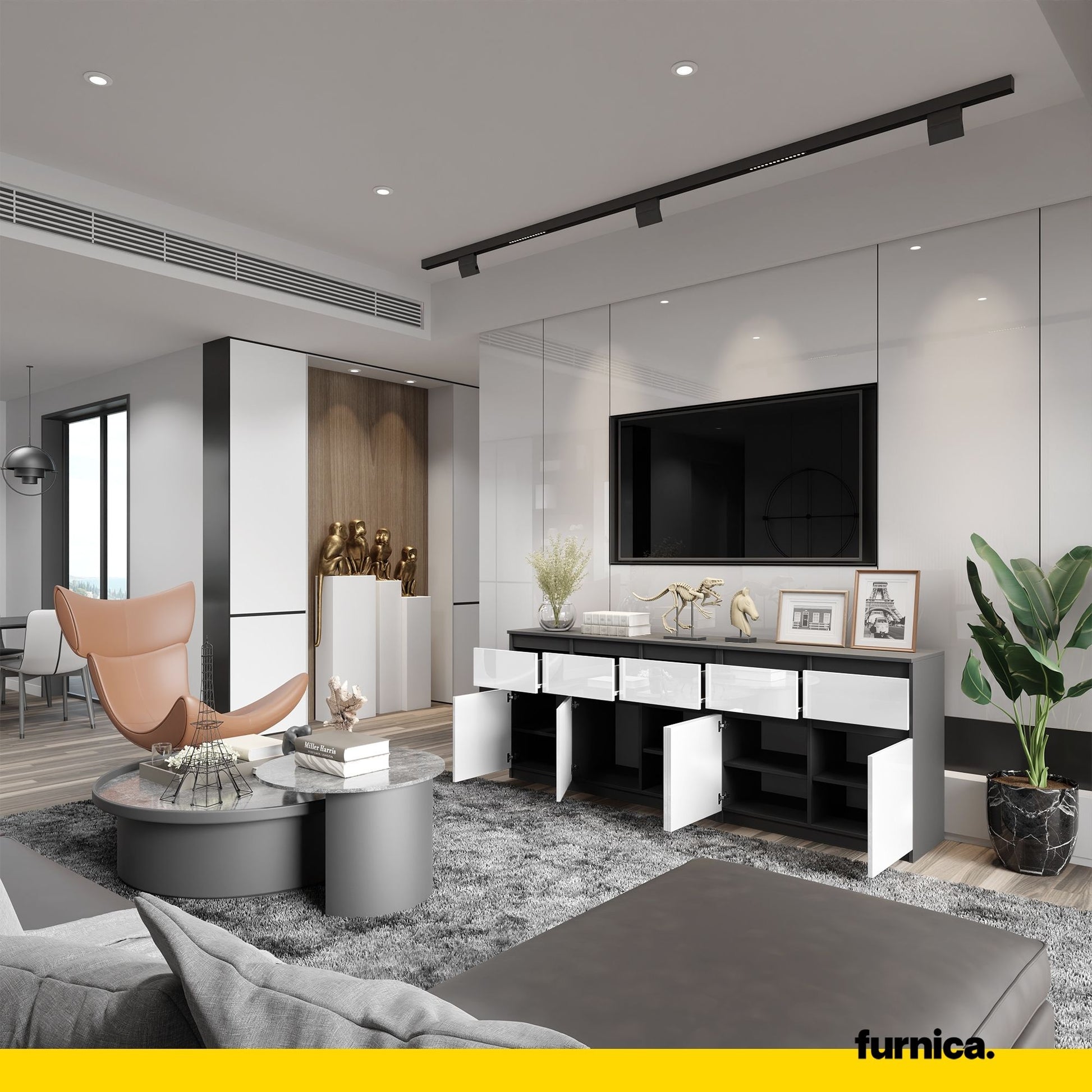 Der anthrazitfarbene Korpus und die weißen Hochglanzfronten sind zweifellos eine magische Farbkombination. Sie ist äußerst klassisch, einzigartig, elegant und stilvoll. Eine nützliche Kommode wie diese fügt sich perfekt in den Rest Ihres Hintergrunds ein. Sie sieht einzigartig und vielseitig aus. Sie werden den Kauf eines solch günstigen Möbelstücks sicherlich nicht bereuen, da sowohl die optische als auch die technische Seite bis ins kleinste Detail verfeinert wurden.