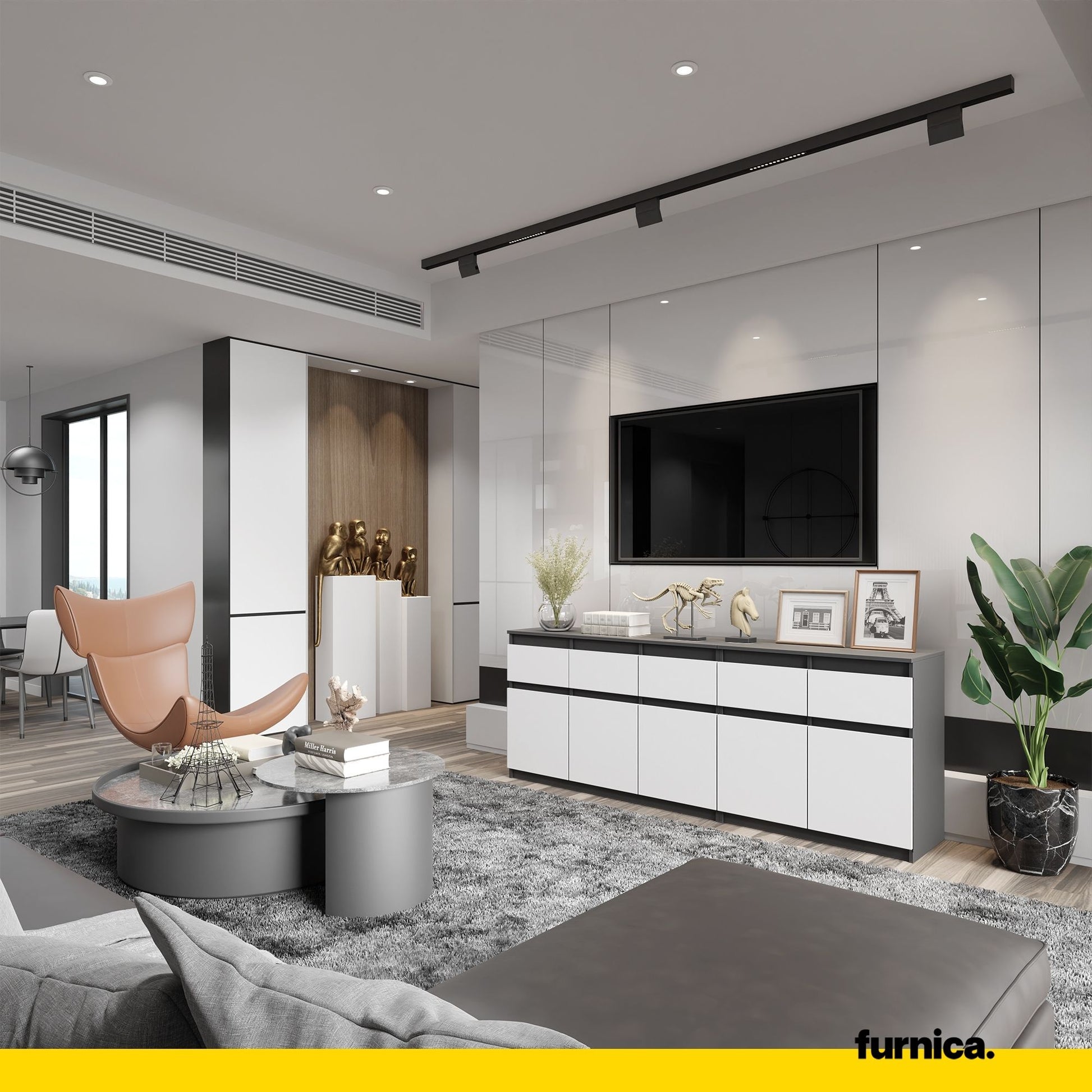 Unsere funktionale Kommode ist mit 5 geräumigen Schubladen und 5 Türen ausgestattet. Ein so großer Aufbewahrungsschrank ist eine gute Lösung, da Ihr Raum nicht so leer wirkt und er zu einer sehr nützlichen Kommode mit viel Platz wird. Ganz zu schweigen davon, dass der anthrazitfarbene Korpus und die weißen matten Fronten perfekt miteinander harmonieren. Dieses günstige Möbelstück sieht sehr klassisch, elegant, frisch und stilvoll aus. Es ist auch äußerst vielseitig, sodass Sie es sicherlich auf den ersten Blick und bei der ersten Berührung lieben werden.