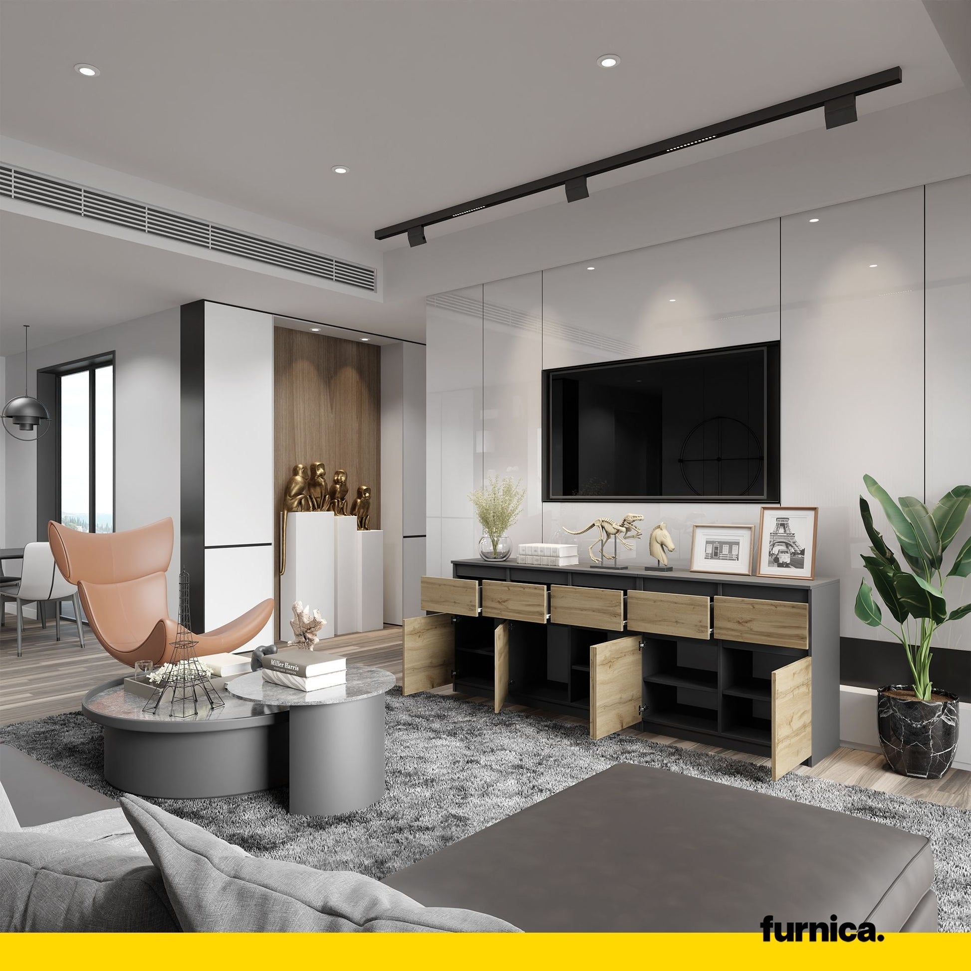 Wenn es an der Zeit ist, in ein neues Möbelstück zu investieren und Sie sich nicht sicher sind, welche Art von moderner Kommode Sie wählen sollten, könnte dieses praktische Sideboard für Sie interessant sein. Es wurde aus einer dicken melaminbeschichteten Spanplatte und einer hochdichten Faserplatte gefertigt, sodass es ein sehr solides, stabiles, sicheres und langlebiges Möbelstück ist. Es wird Ihnen definitiv viele Jahre lang Freude bereiten, sodass Sie sich um solche Details keine Sorgen machen müssen.