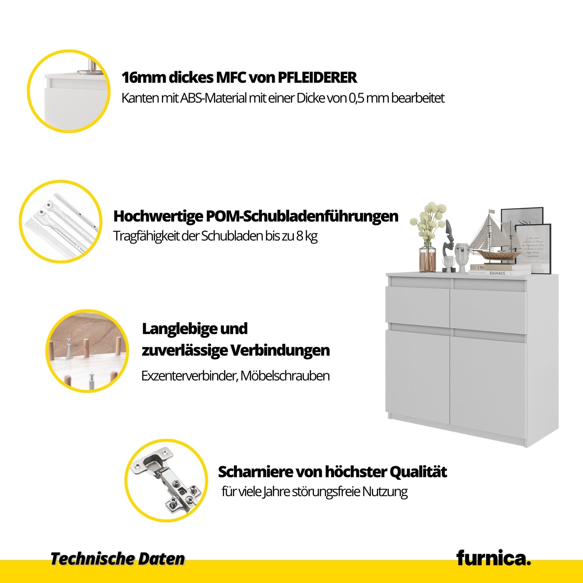 Hergestellt aus 16 mm dicken melaminbeschichteten Spanplatten (MFC). Die Kanten sind mit ABS-Materialmit einer Dicke von 0,5 mm versehen.