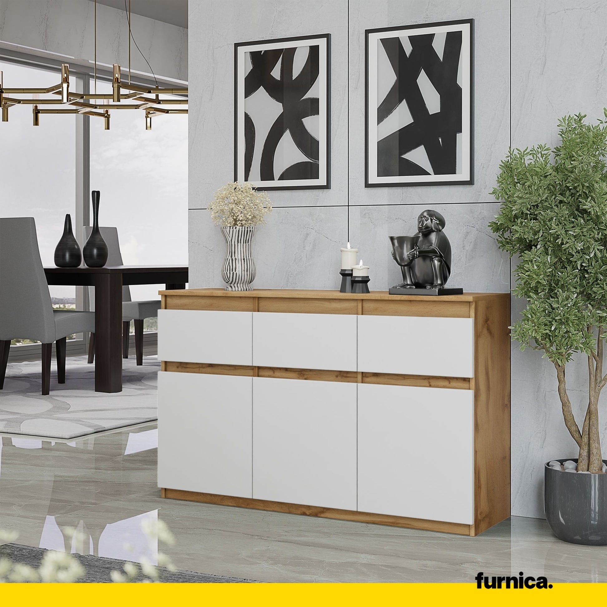 NOAH - Kommode mit 3 Schubladen und 3 Türen - Schlafzimmer Anrichte Stauraumschrank Sideboard - Wotan Eiche / Weiß Matt H75cm B120cm T35cm