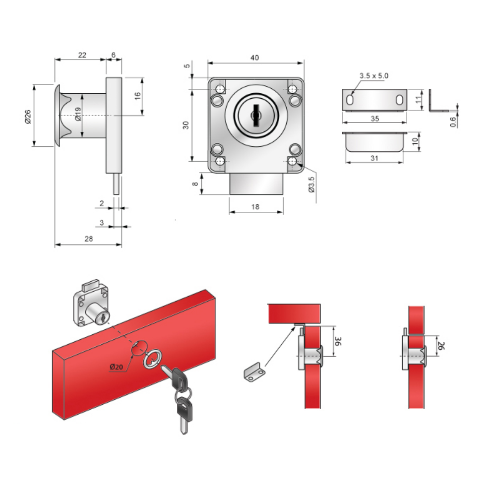 Die vorgestellten Möbelschlösser erfordern kein Spezialwissen – die Installation ist sehr einfach. Das Schloss ist universell und passt daher zu einer Vielzahl von Schränken und Türen. Die quadratische Form und die Befestigung mit vier Schrauben erhöhen das Sicherheitsniveau. Sie können auch eine andere Art von Schutz für Schränke und Türen wählen. Schauen Sie sich dazu die anderen Kategorien im Furnica-Shop an. Wir sind sicher, dass Sie finden werden, was Sie brauchen.