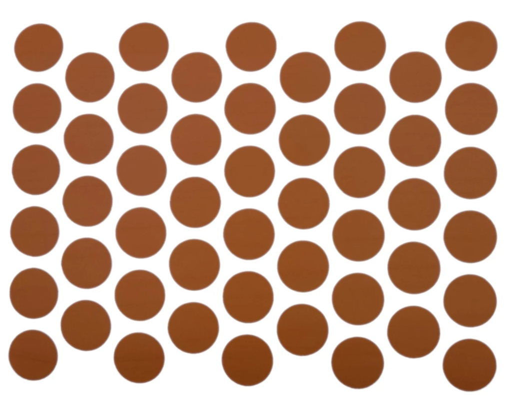 Der Bogen besteht aus 50 Stück selbstklebenden Abdeckkappen mit einem Durchmesser von je 14 mm. Die birnenartige, sanfte Farbe wird sicherlich nicht auffallen, und die Verwendung von Abdeckkappen dieser Farbe wird sich in jede Umgebung einfügen.