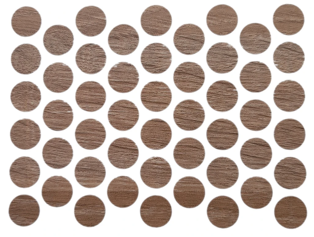 Die Farbe dieser Serie ist Sonoma Eiche. Sie wird in vielen Holzoberflächen einen Platz finden. Die Scheiben haben einen Durchmesser von 14 mm und werden in einem großen Bogen mit 50 Abdeckkappen geliefert.