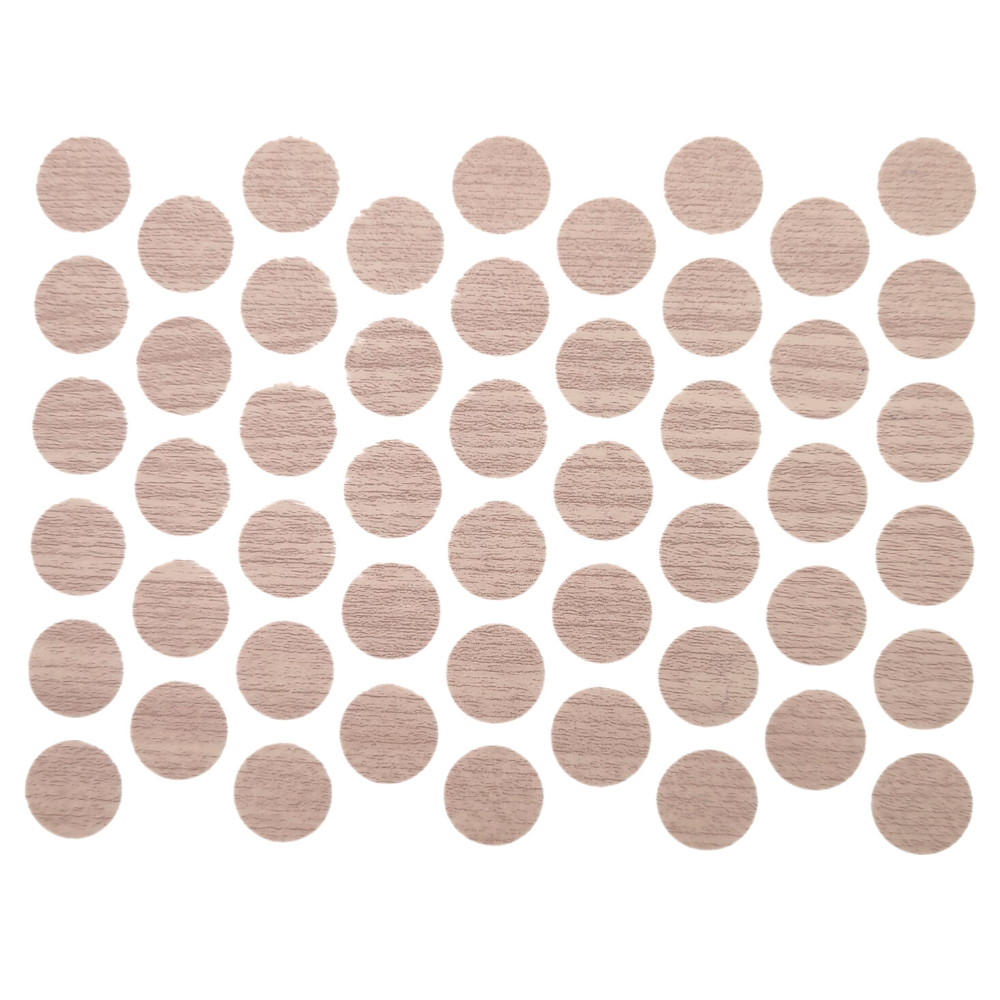 Es ist ratsam, die Farbe der Abdeckkappen auf die Möbel abzustimmen, die Sie verschönern möchten. Dann ist alles gut aufeinander abgestimmt, was die Wirkung noch verbessert. Die Fichtenfarbe wird sich in die hölzerne Umgebung einfügen. Ein einzelnes Blatt besteht aus 50 Stück 14-mm-Scheiben.