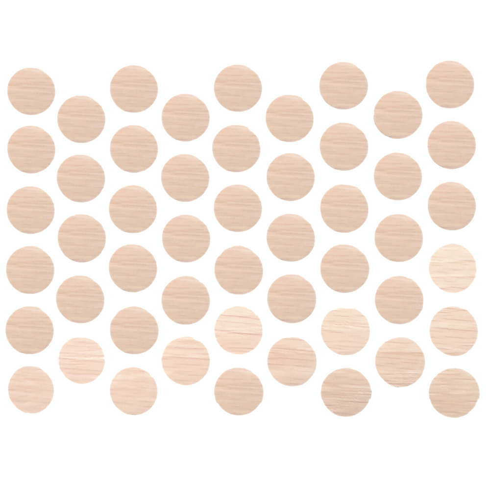 Das Schraubenabdeckkappen-Set wird mit einem Bogen geliefert, der 50 Kappen mit einem Durchmesser von 14 mm enthält. Die milchige Eichenfarbe unterstreicht die Klasse und wird eine perfekte Option sein, wenn Holzmöbel im Spiel sind.