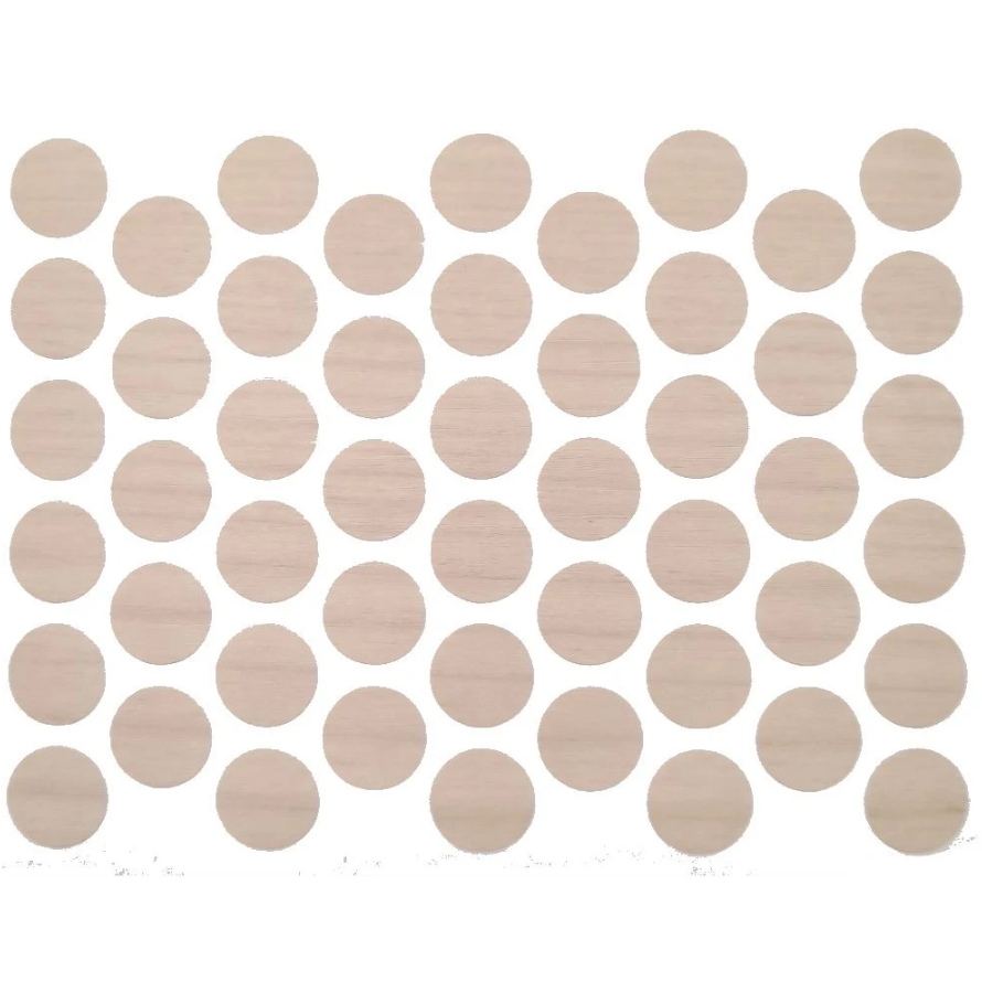Schraubenabdeckkappen sind in Bögen zu 50 Stück erhältlich. Jede Abdeckkappe hat einen Durchmesser von 14 mm und ist damit ein vielseitiges Produkt, das für die meisten Schrauben geeignet ist. Die natürliche Birkenfarbe verleiht jedem Möbelstück ein hochwertiges und klassisches Aussehen.