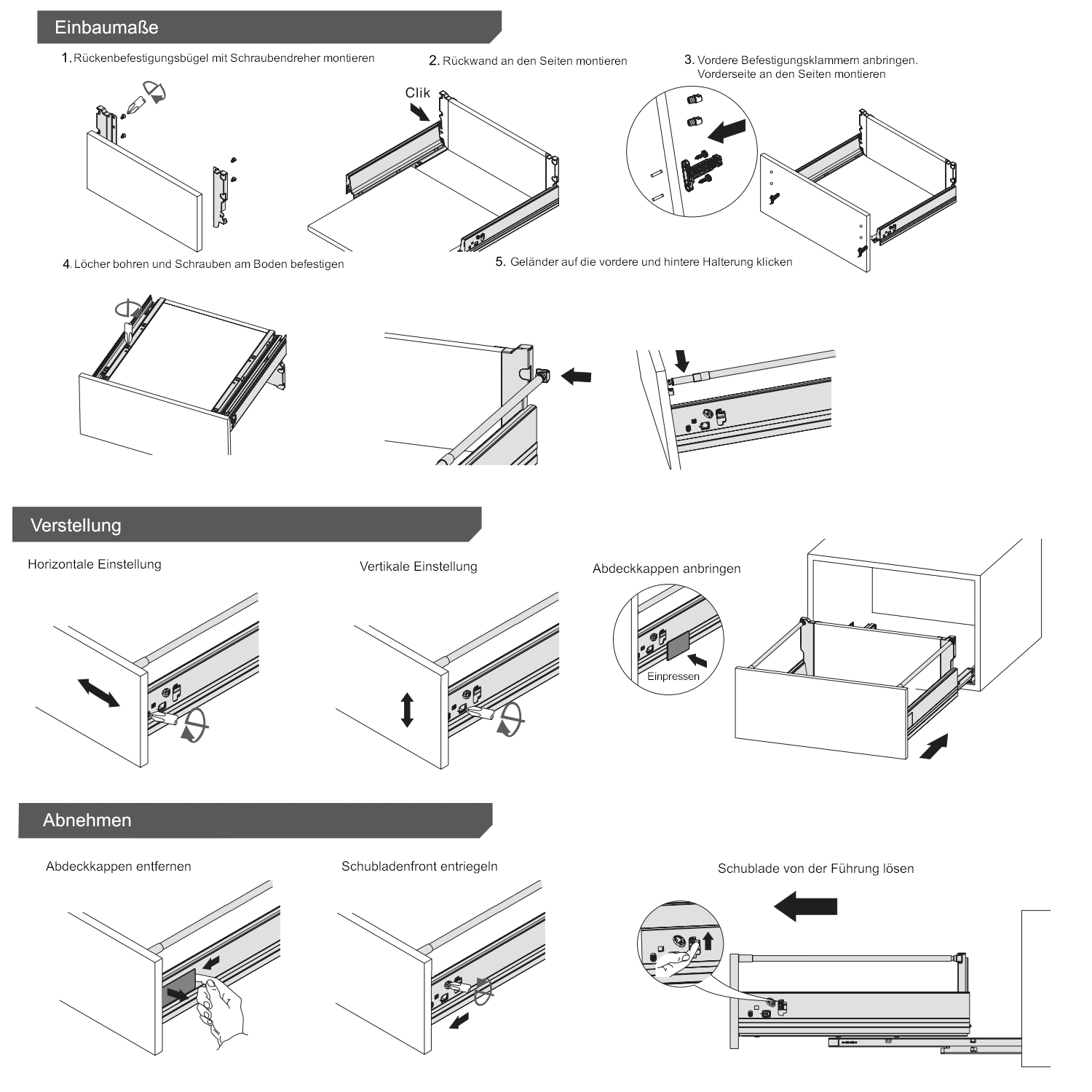 Schubladenführungen dieser Art sind auch die beliebtesten - sie haben alles, was ein normaler Mensch braucht. Von der Langlebigkeit bis hin zur Vollauszugsfunktion. Es gibt nichts, was Sie mehr brauchen als Soft-Close, Volleinstellung und Vollauszug - und wenn Sie das einmal hatten, wird es Ihnen schwer fallen, es beim nächsten Mal nicht zu wollen. Das alles macht das Leben viel einfacher und schneller. Sie sparen Zeit, Energie und Nerven - Sie müssen sich nicht mehr mit all dem herumschlagen, was Sie bei Ihren bisherigen Auszugsschienen gestört hat.